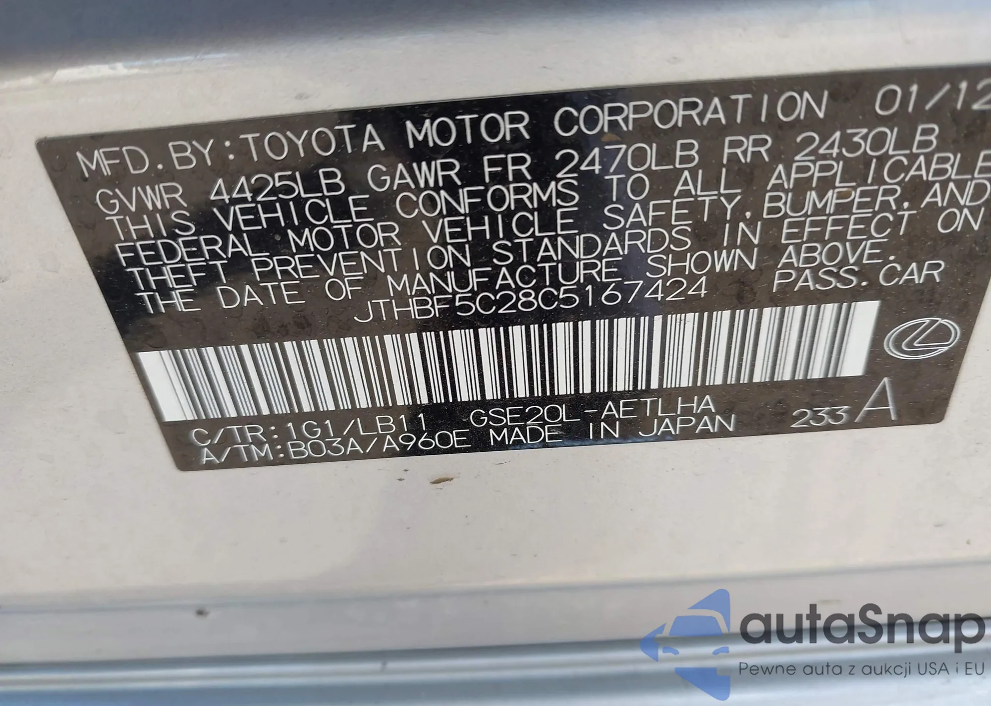 LOT: 43466152 VIN: JTHBF5C28C5167424