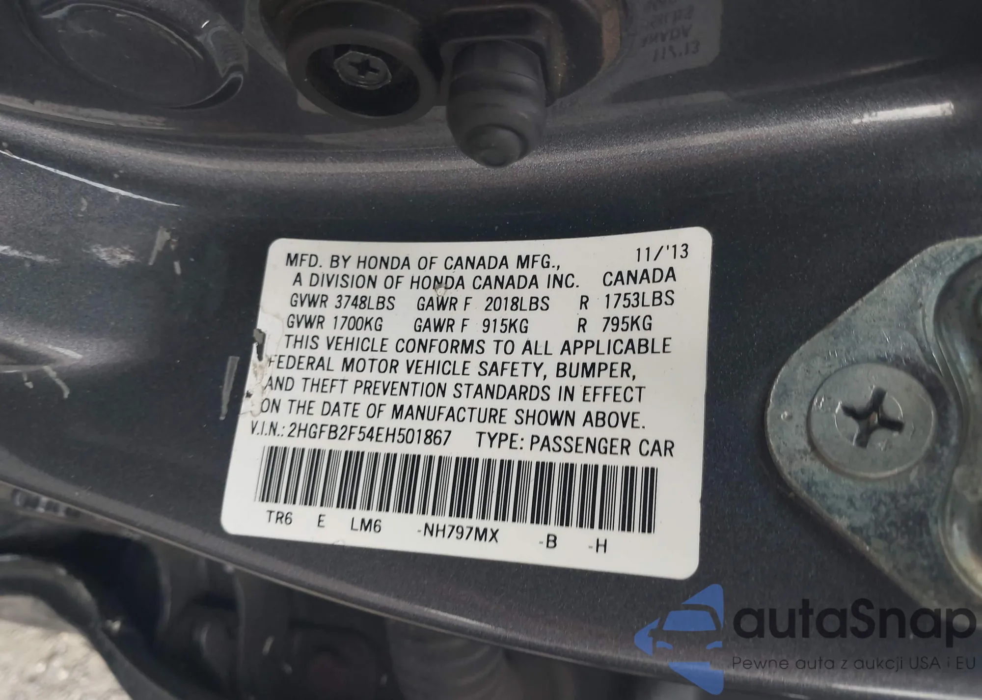 LOT: 43206700 VIN: 2HGFB2F54EH501867