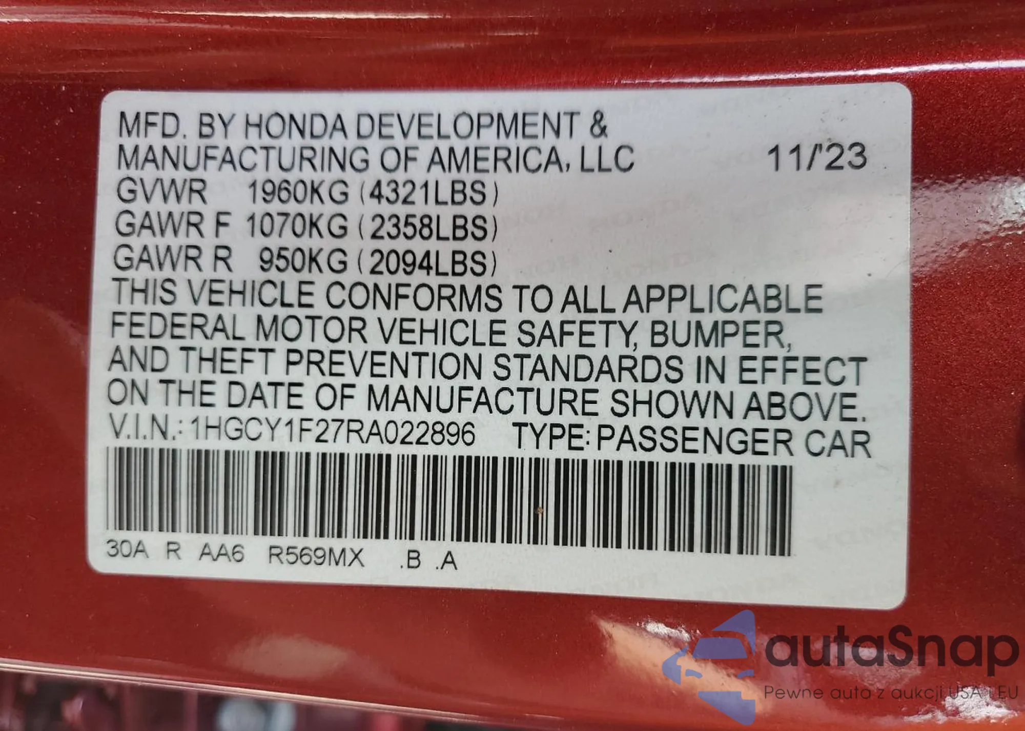 • VIN 1HGCY1F27RA022896