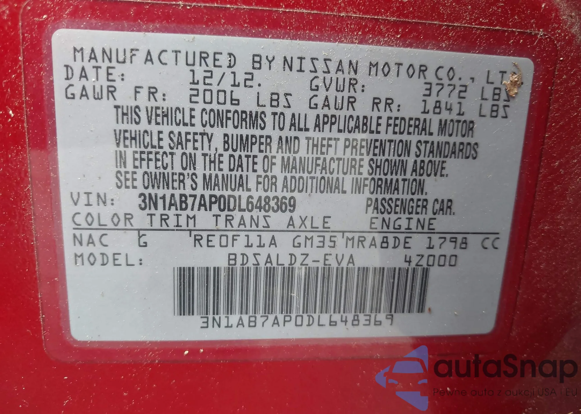 • VIN 3N1AB7AP0DL648369