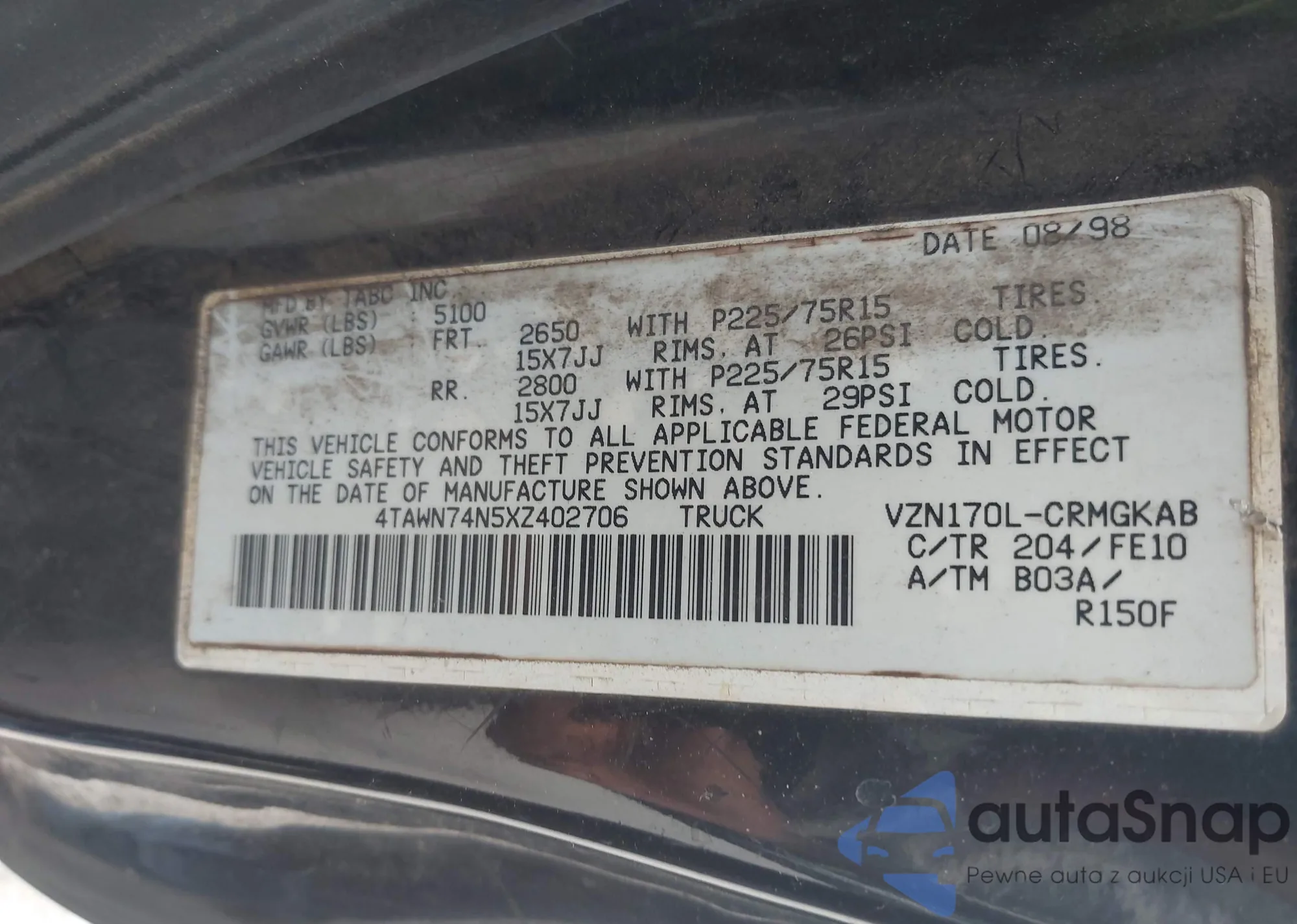 • VIN 4TAWN74N5XZ402706