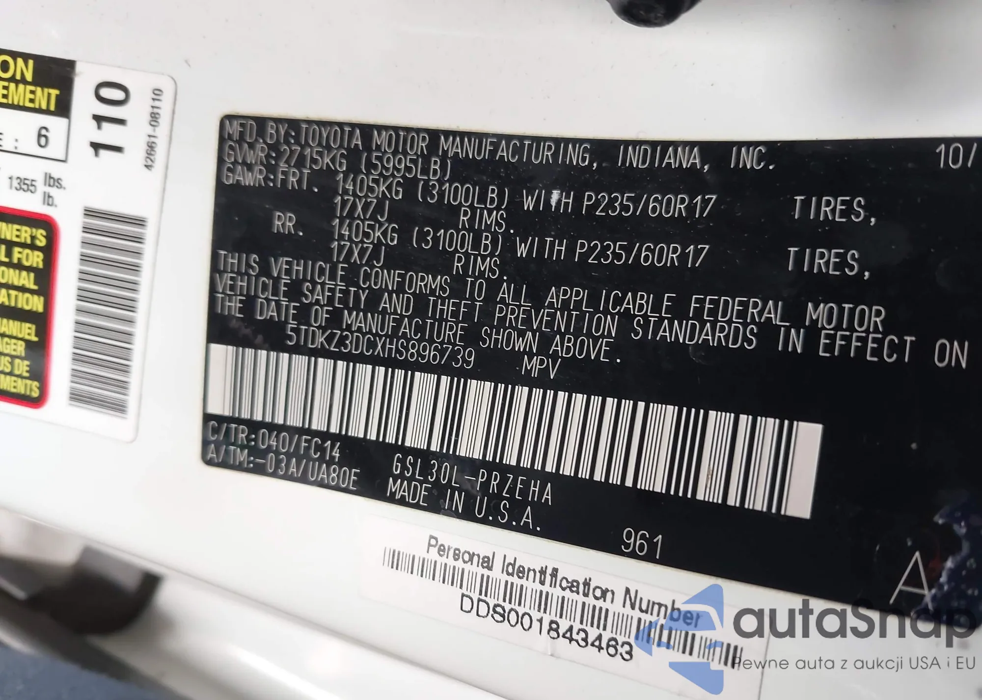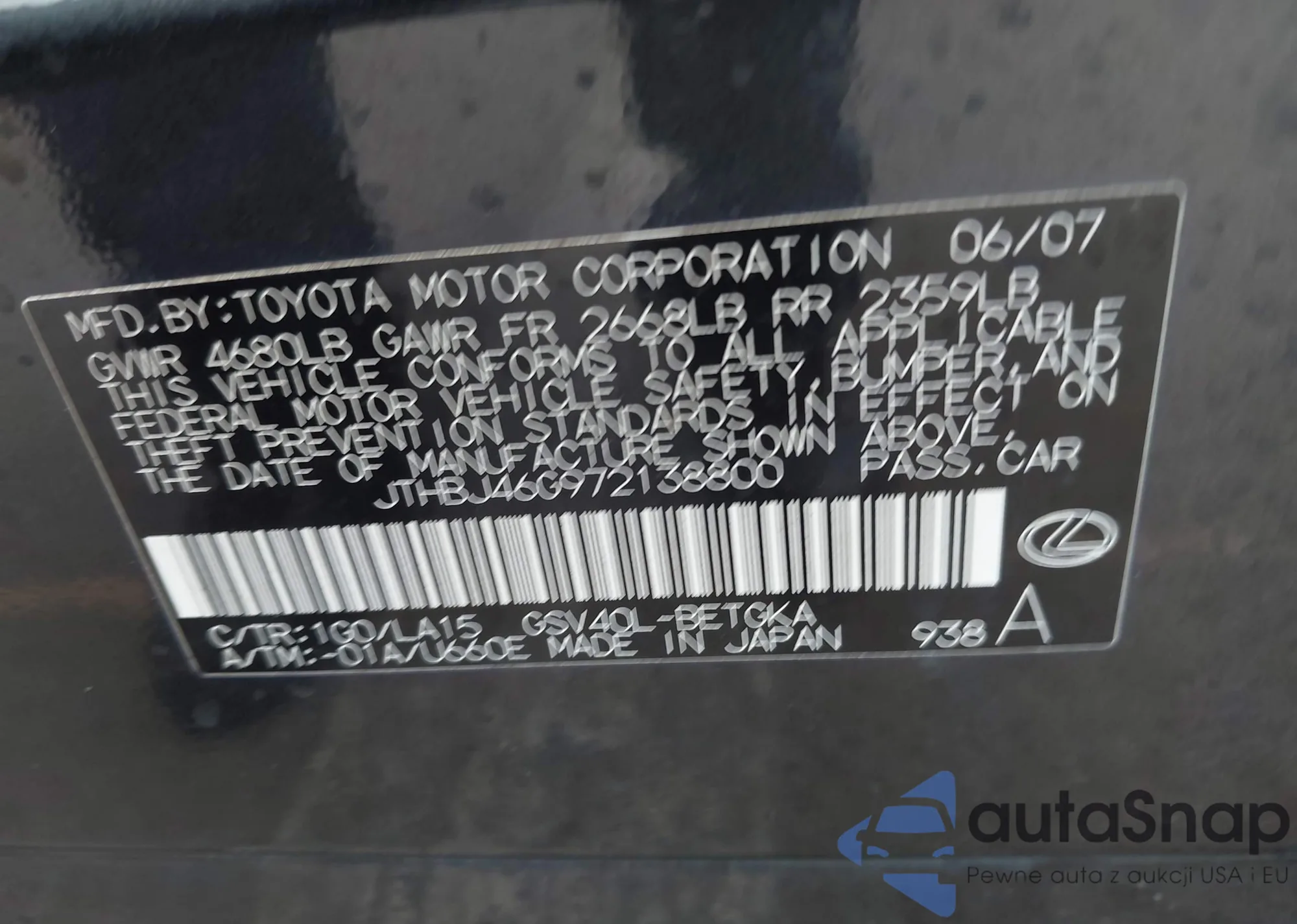 LOT: 42866541 VIN: JTHBJ46G972138800