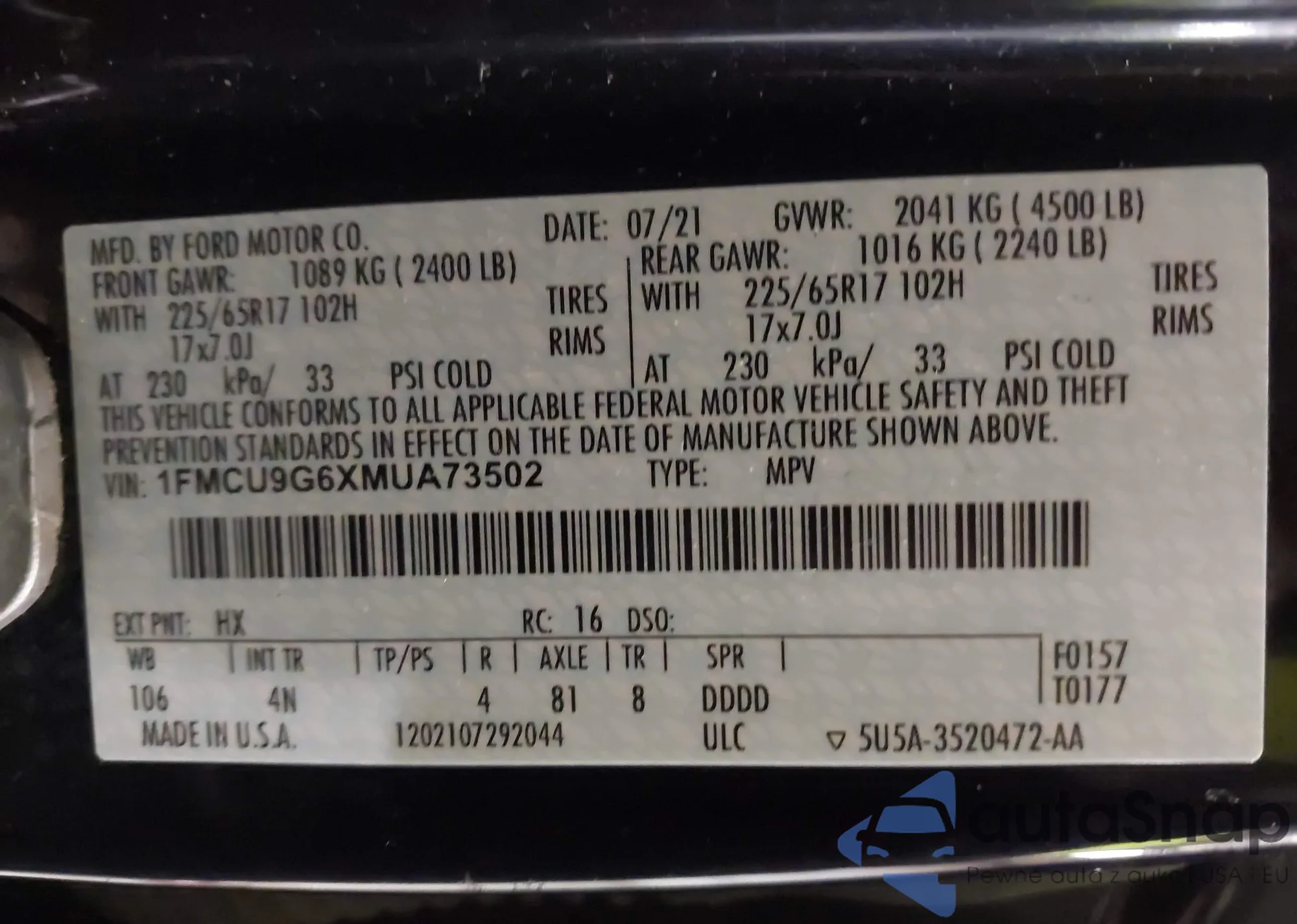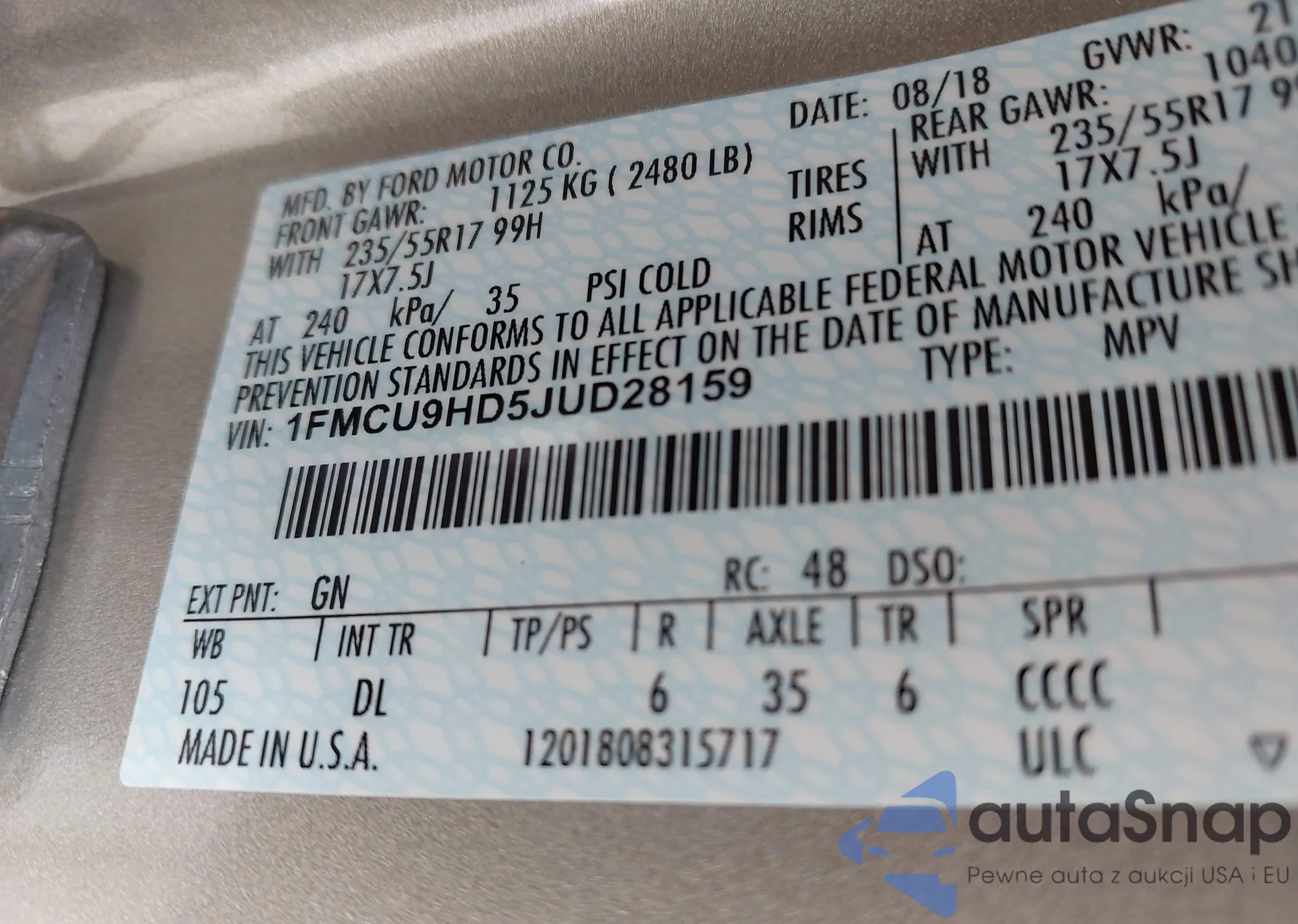 • VIN 1FMCU9HD5JUD28159