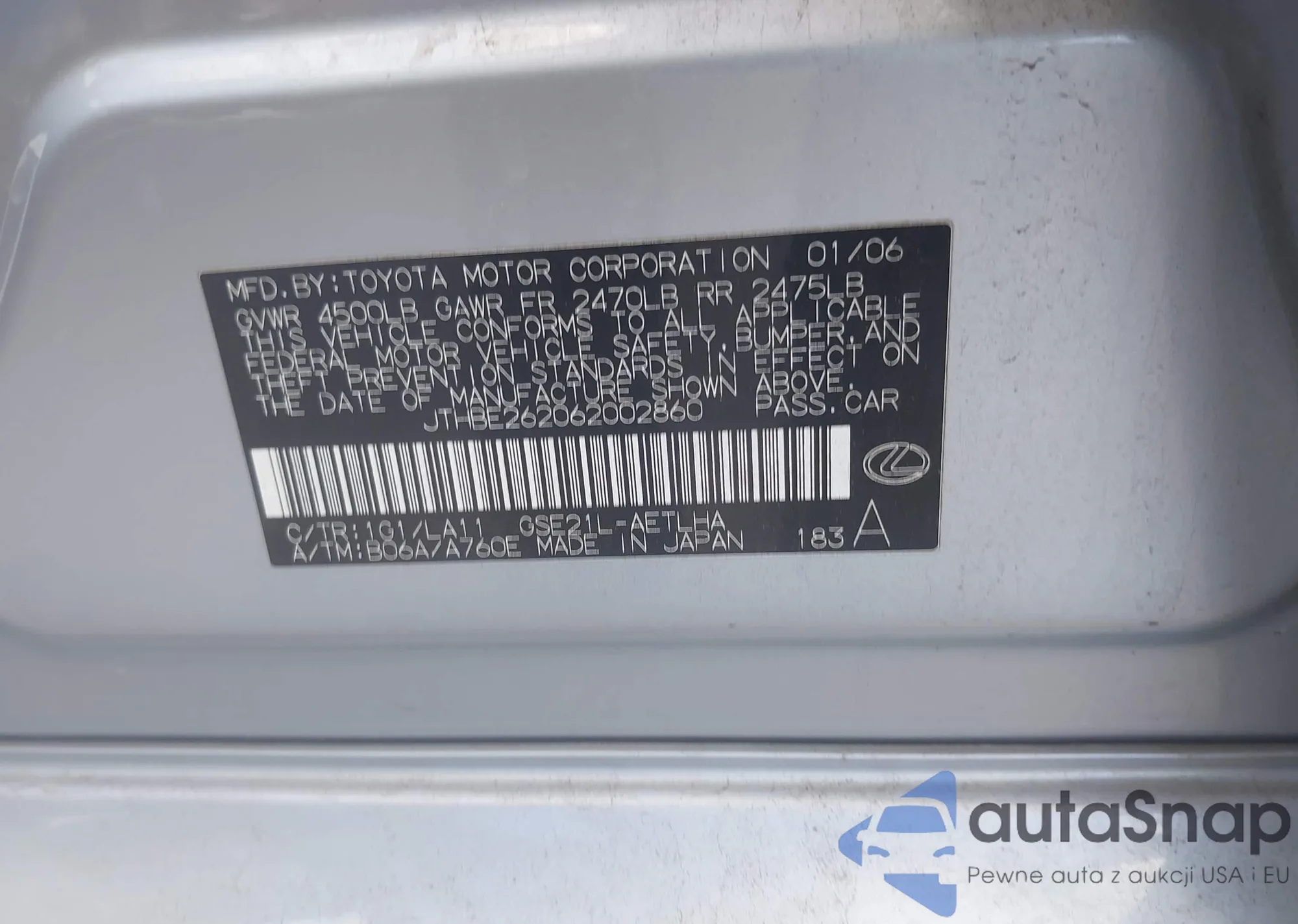 LOT: 42885650 VIN: JTHBE262062002860