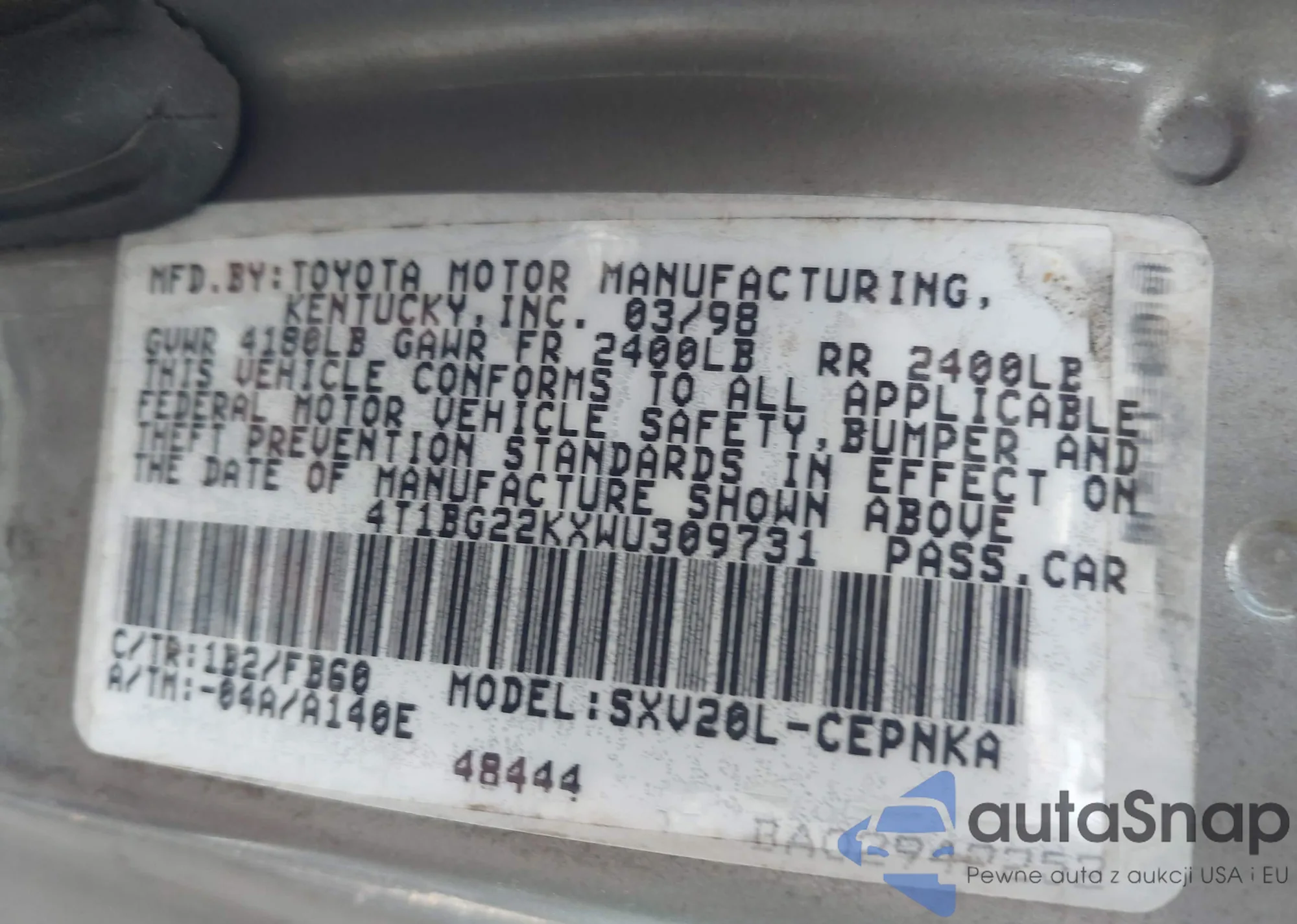 LOT: 43148480 VIN: 4T1BG22KXWU309731