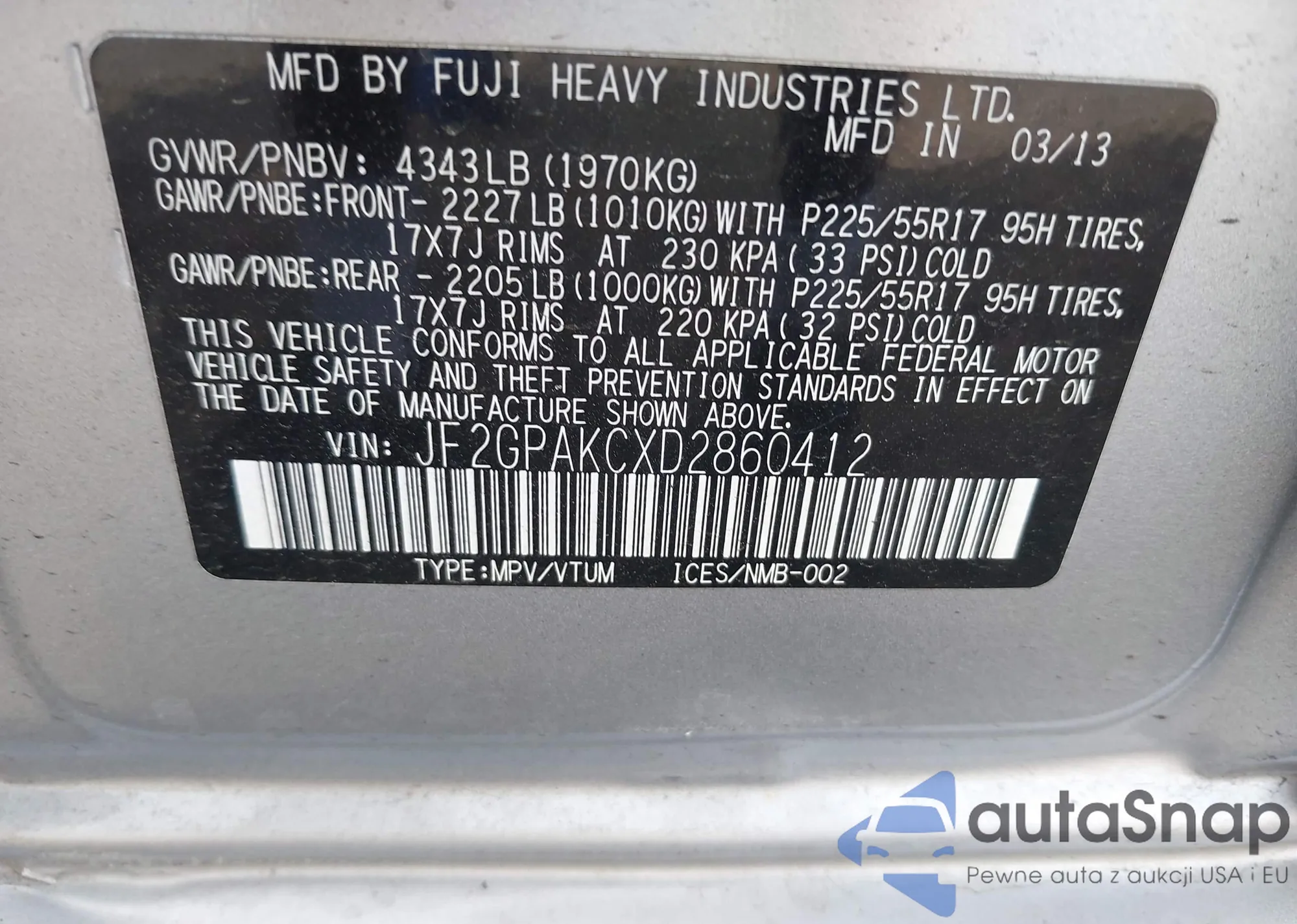 LOT: 43332949 VIN: JF2GPAKCXD2860412