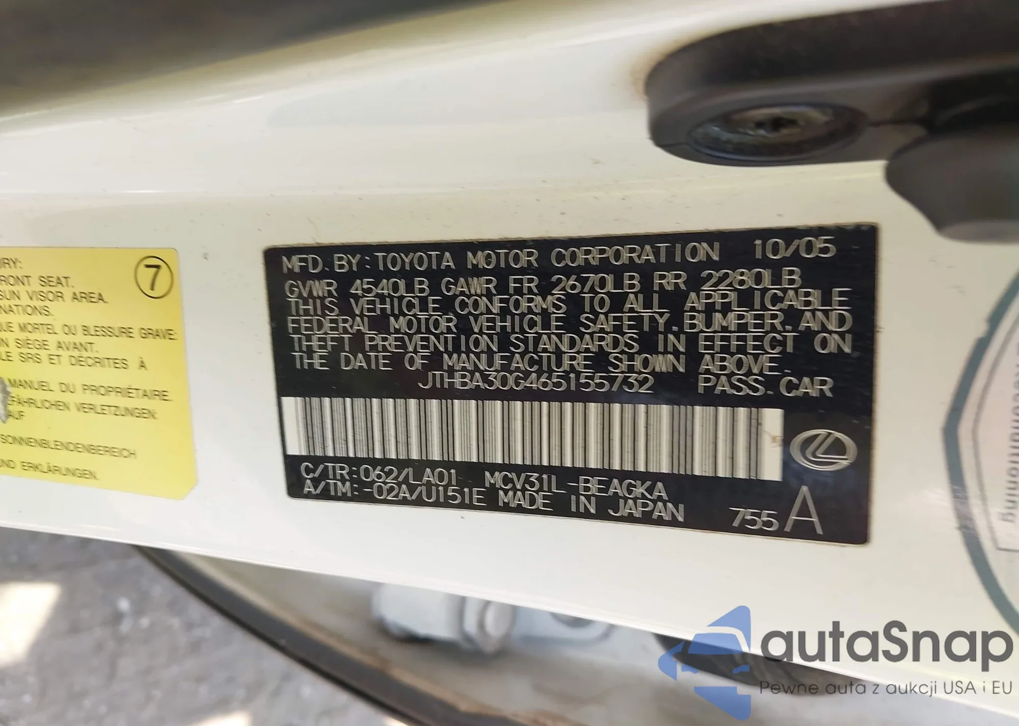LOT: 42500535 VIN: JTHBA30G465155732