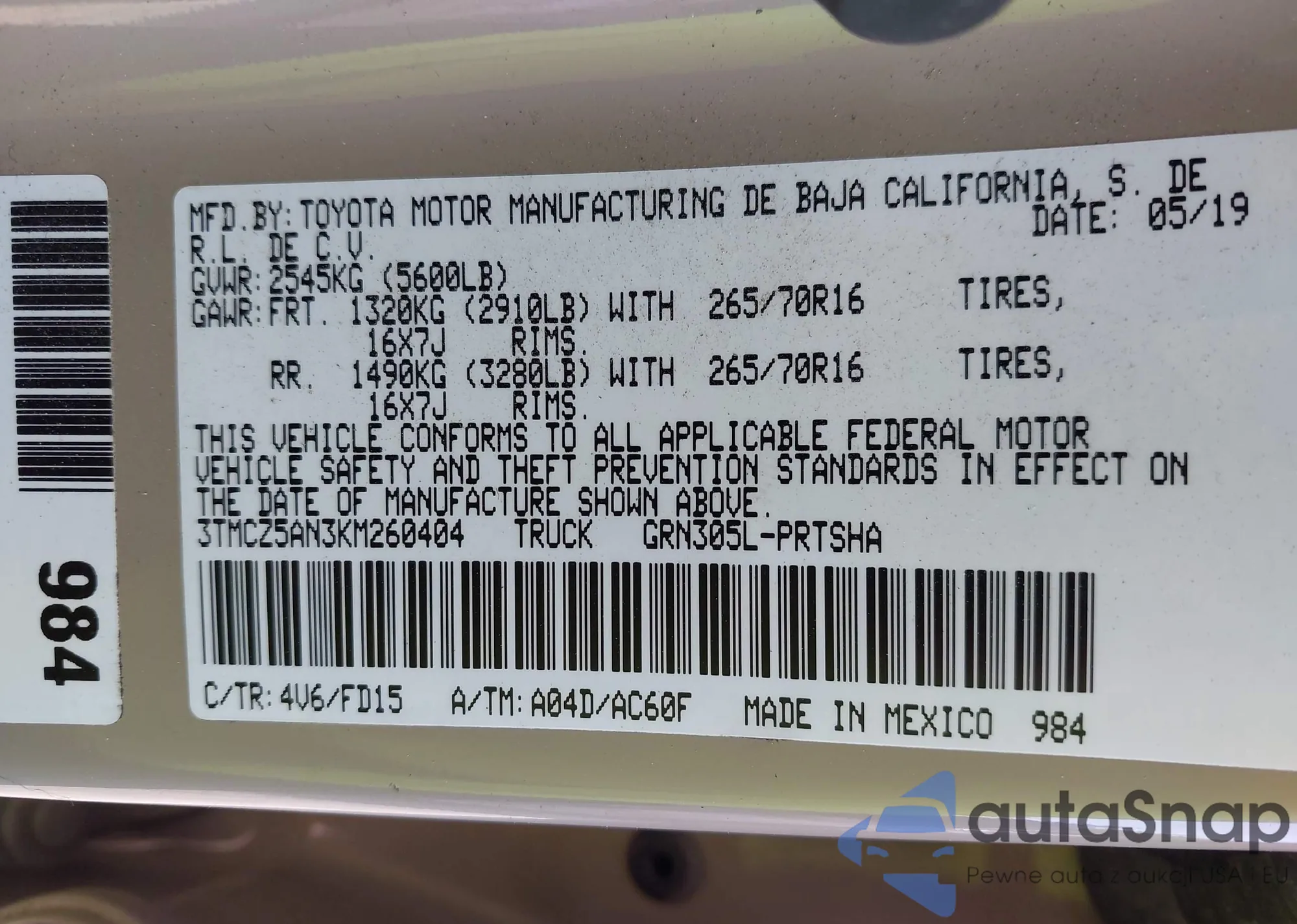• VIN 3TMCZ5AN3KM260404