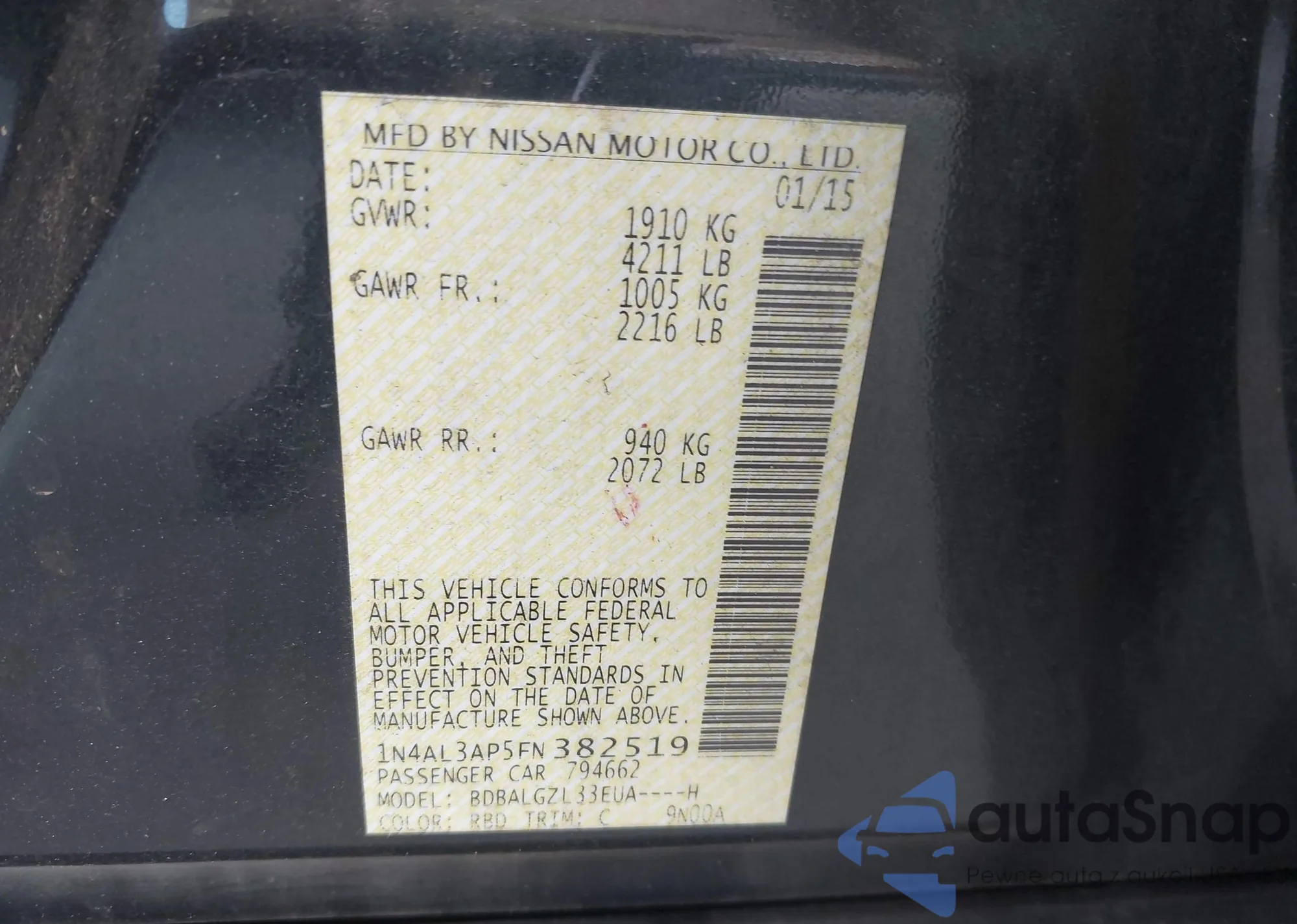 LOT: 43133118 VIN: 1N4BL4BV3KN328797