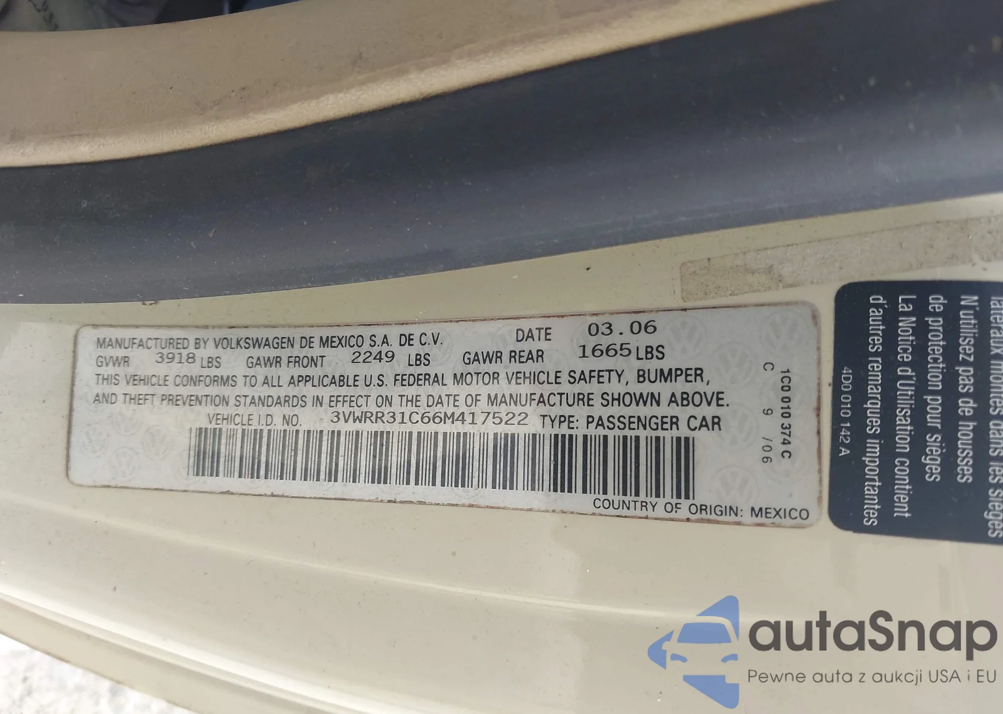 • VIN 3VWRR31C66M417522