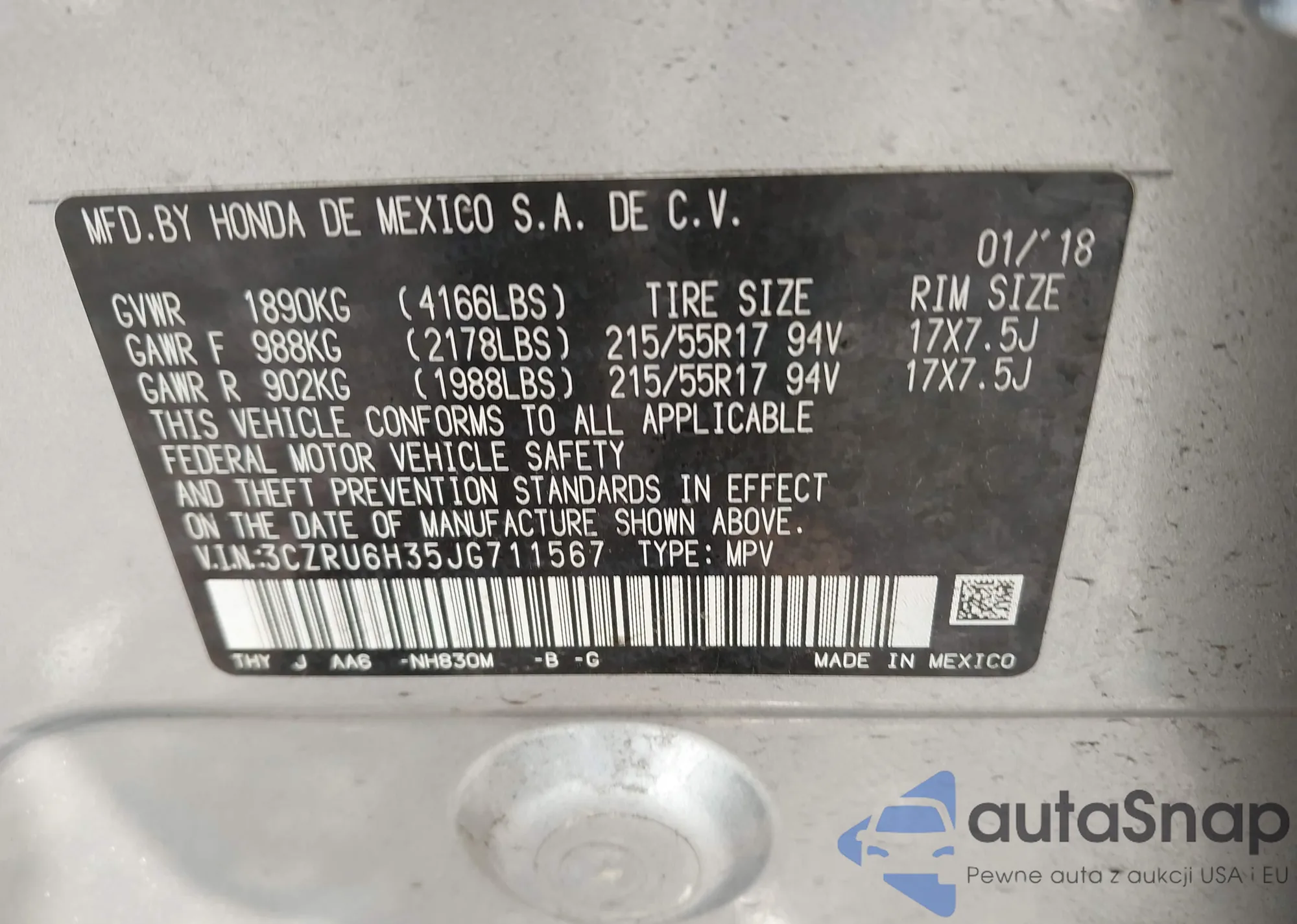 • VIN 3CZRU6H35JG711567