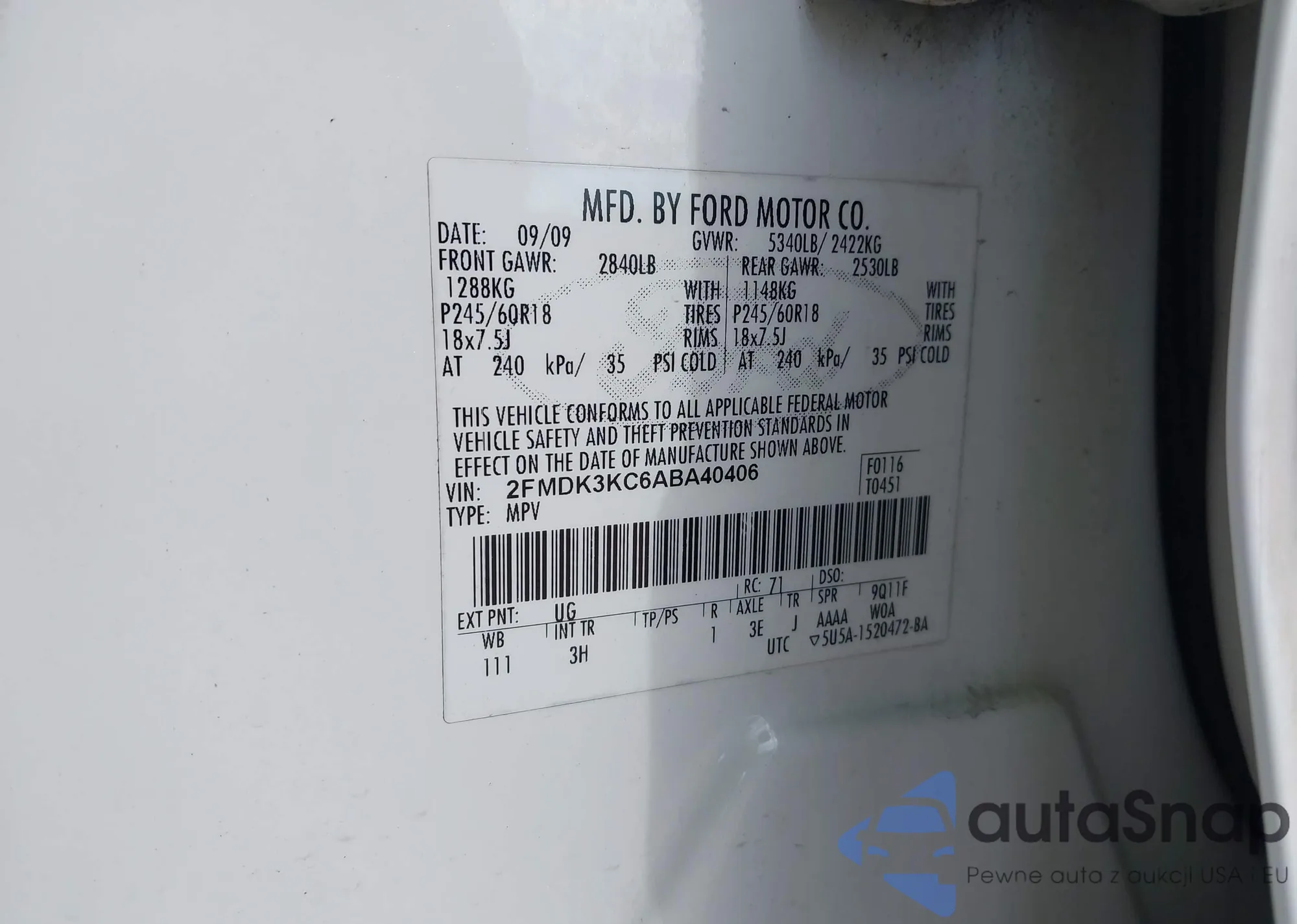 LOT: 43289153 VIN: 2FMDK3KC6ABA40406