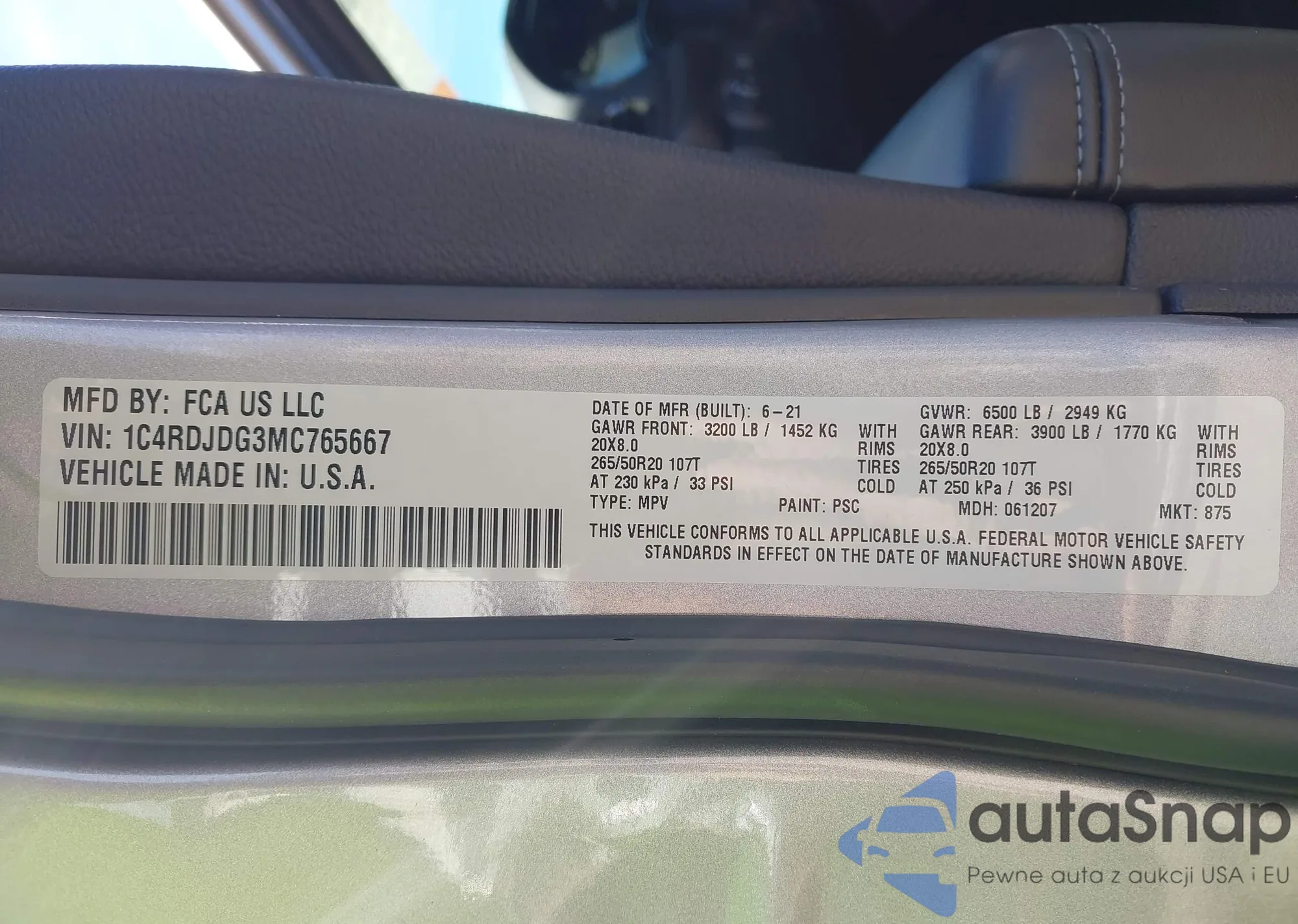 • VIN 1C4RDJDG3MC765667
