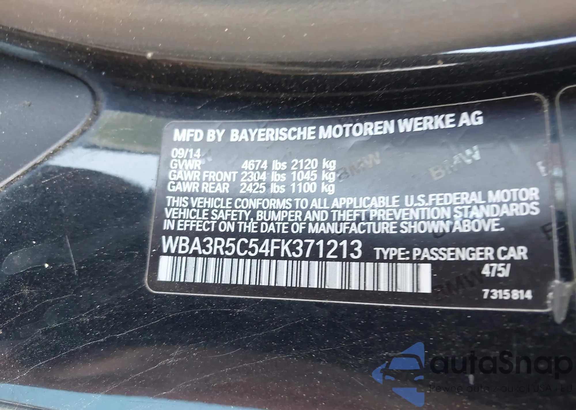 LOT: 43211409 VIN: WBA3R5C54FK371213