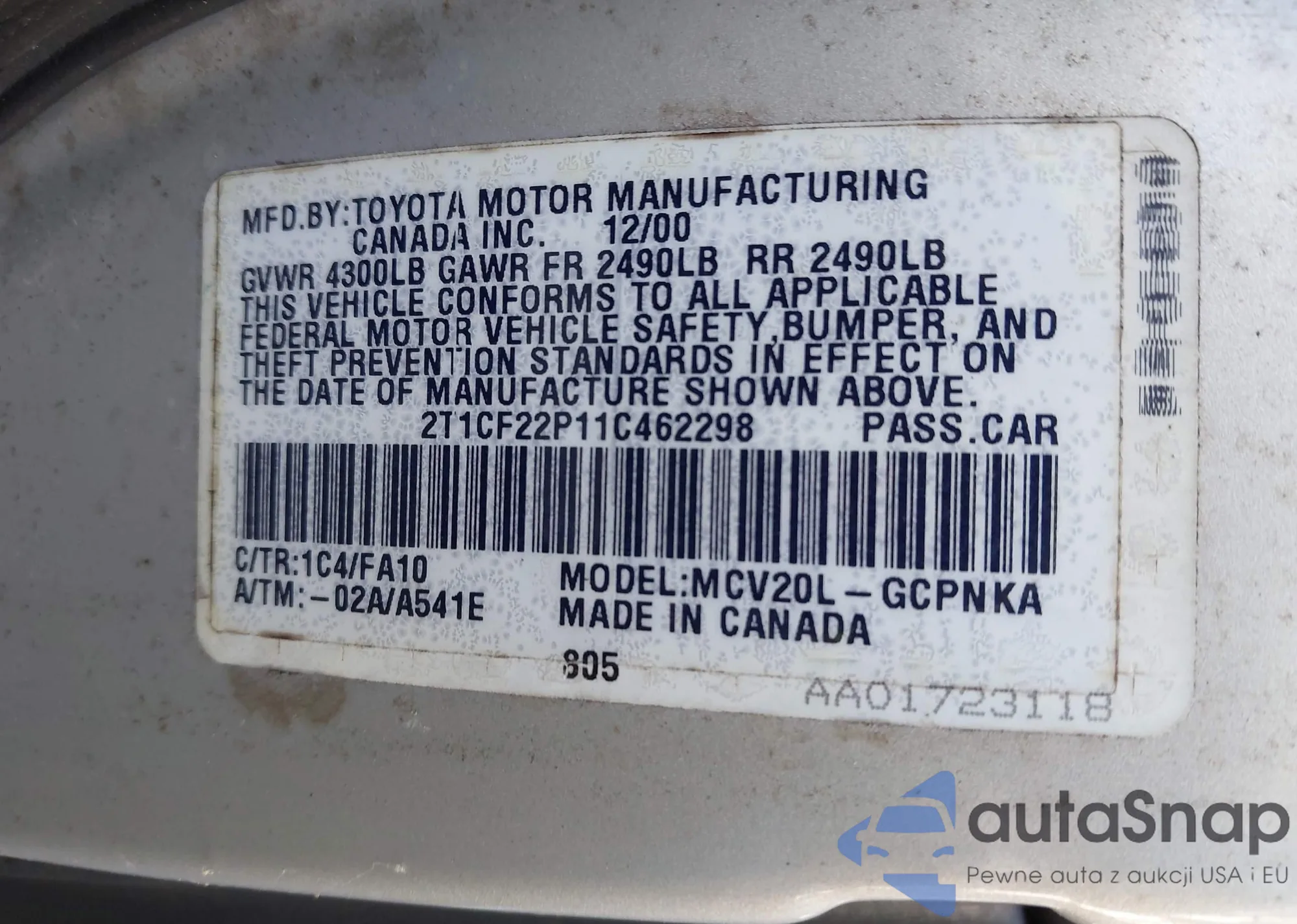 LOT: 43362041 VIN: 2T1CF22P11C462298