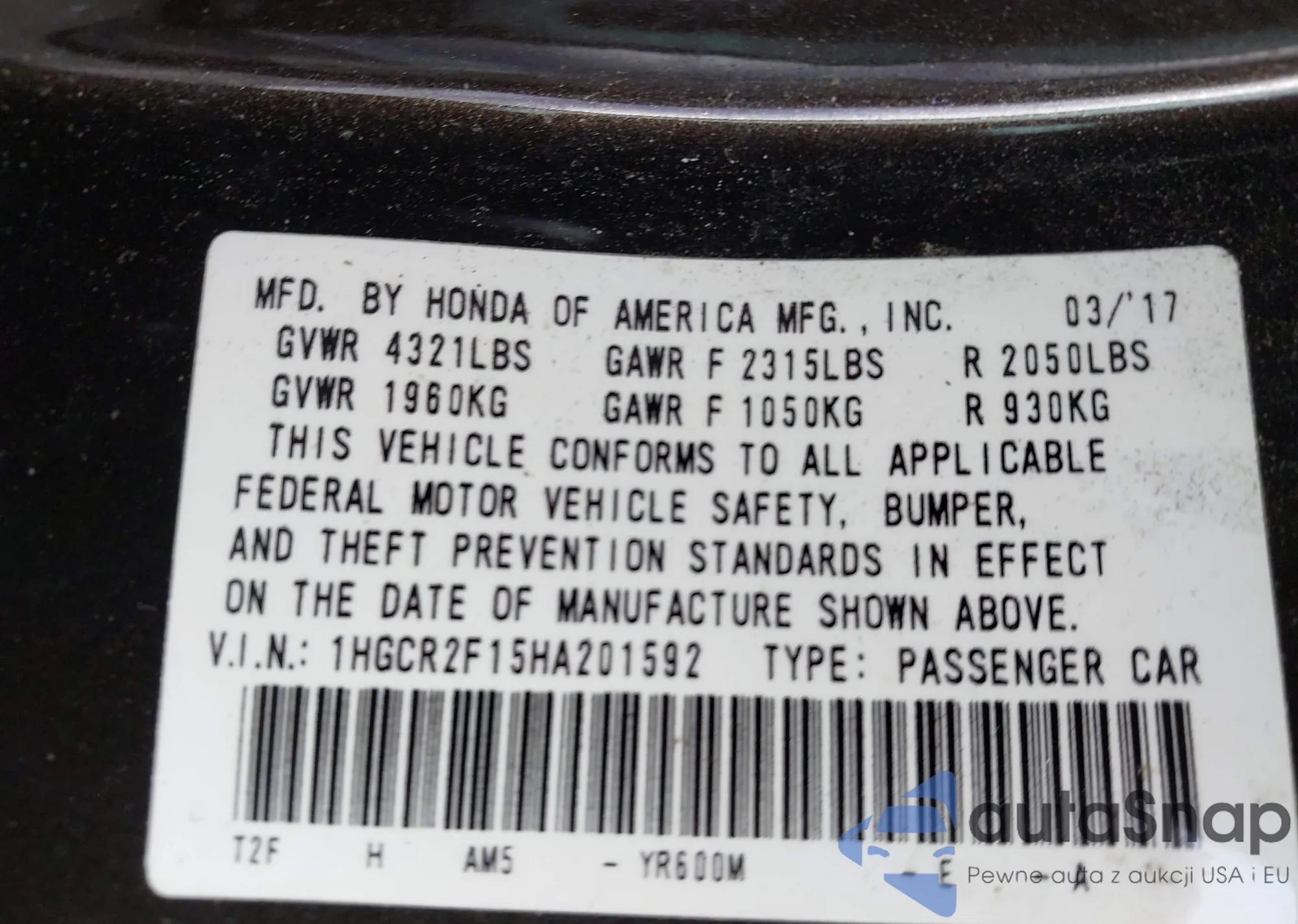 • VIN 1HGCR2F15HA201592
