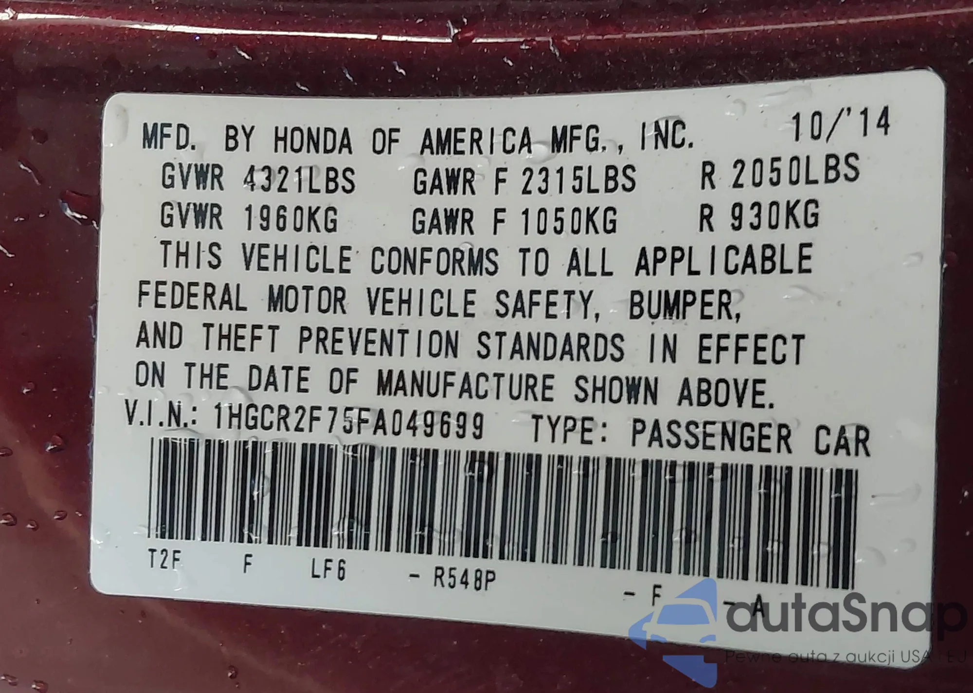 LOT: 43438194 VIN: 1HGCR2F75FA049699
