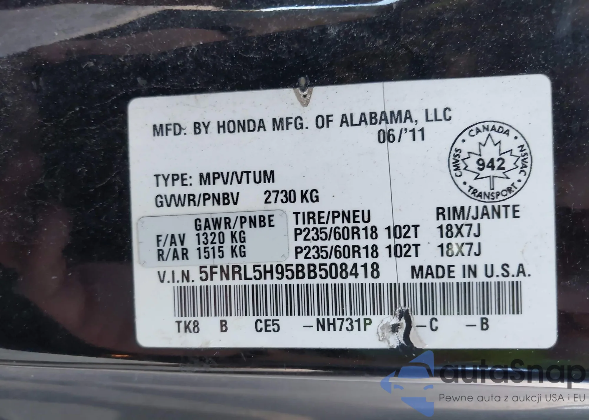 • VIN 5FNRL5H95BB508418