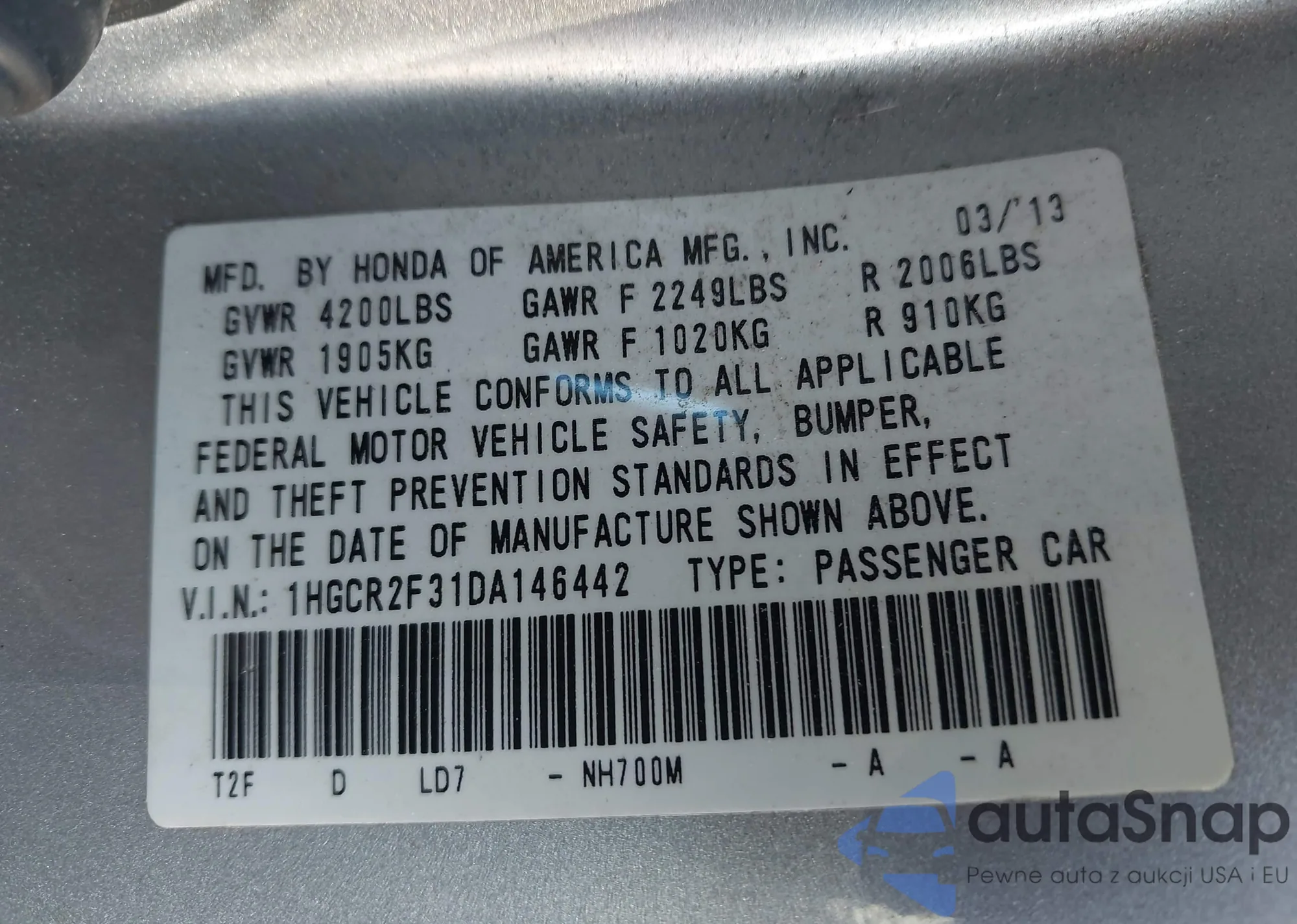 • VIN 1HGCR2F31DA146442