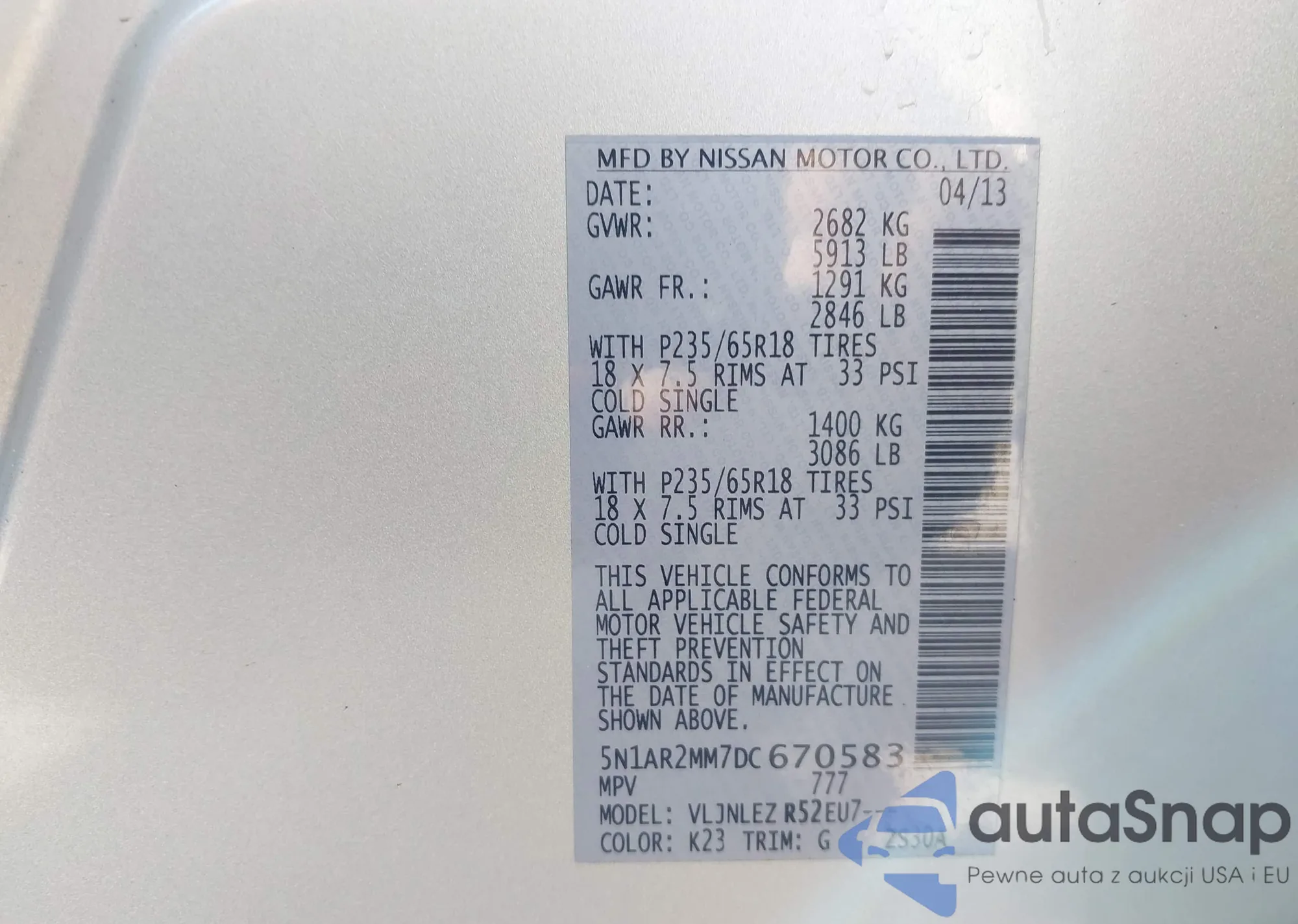 LOT: 43423207 VIN: 5N1AR2MM7DC670583