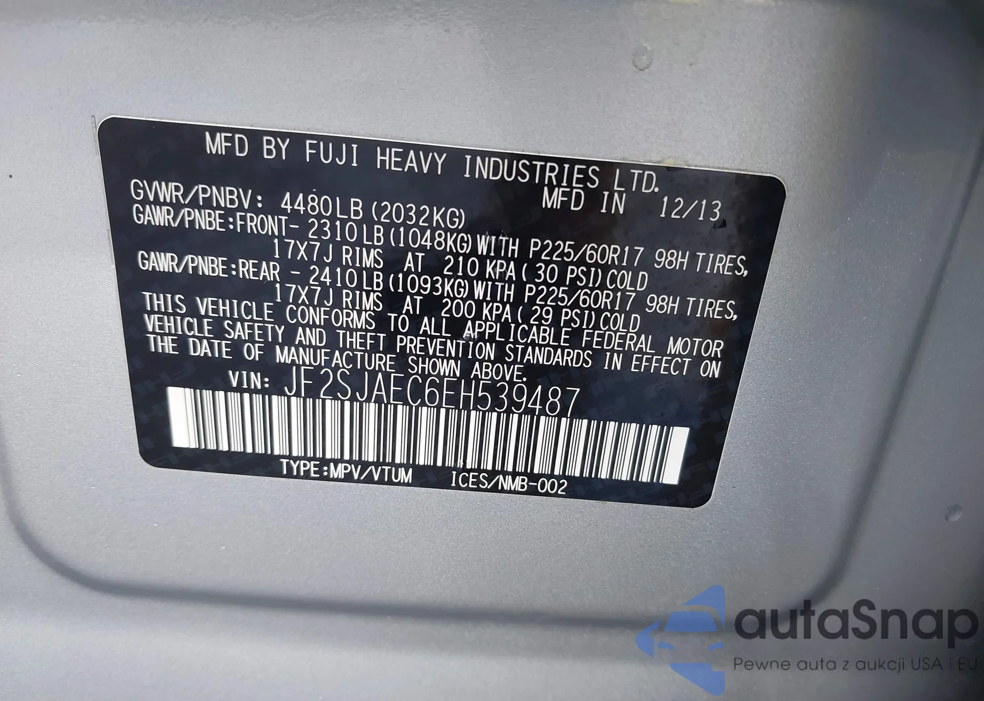 LOT: 43451431 VIN: JF2SJAEC6EH539487