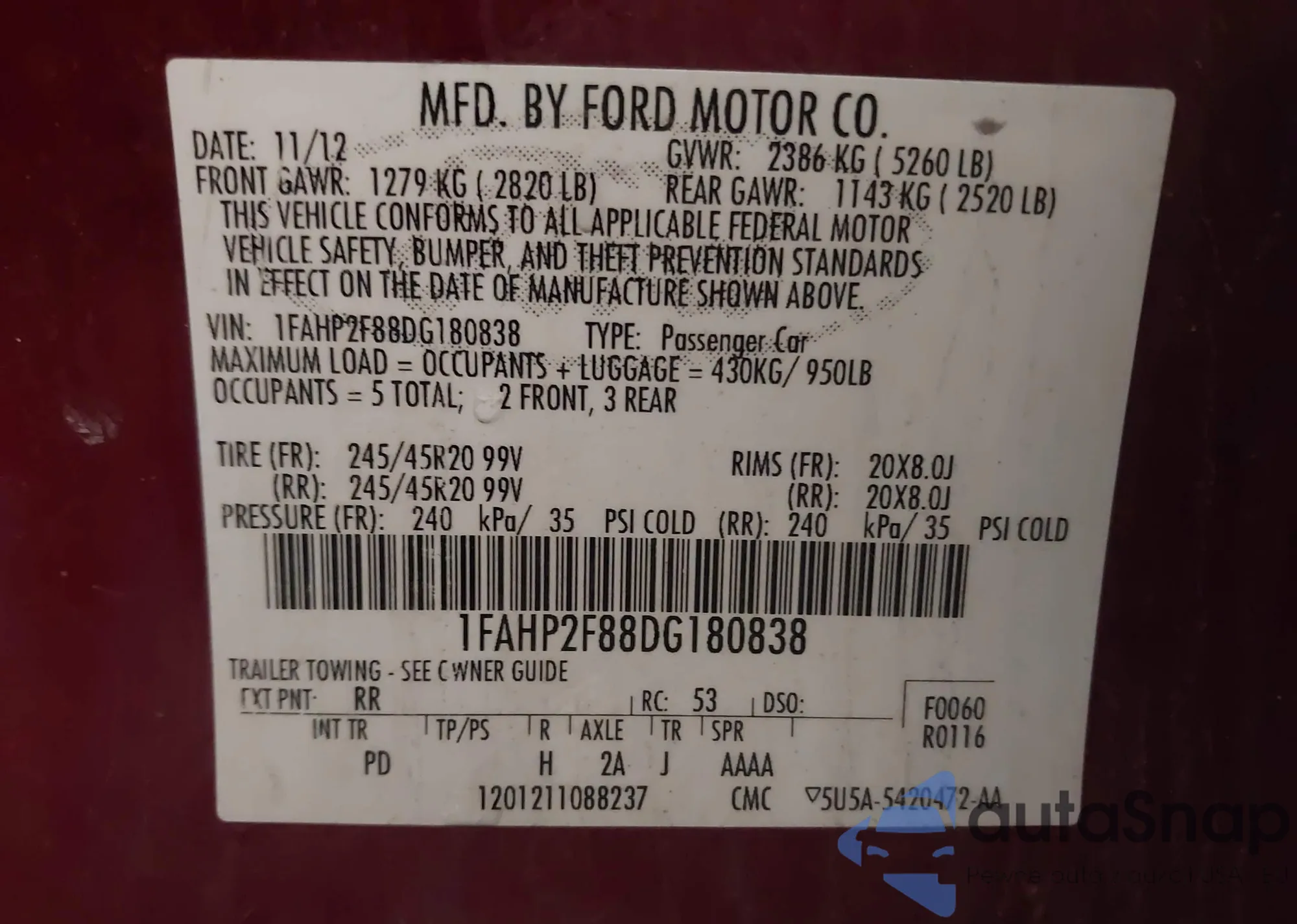 LOT: 43407763 VIN: 1FAHP2F88DG180838