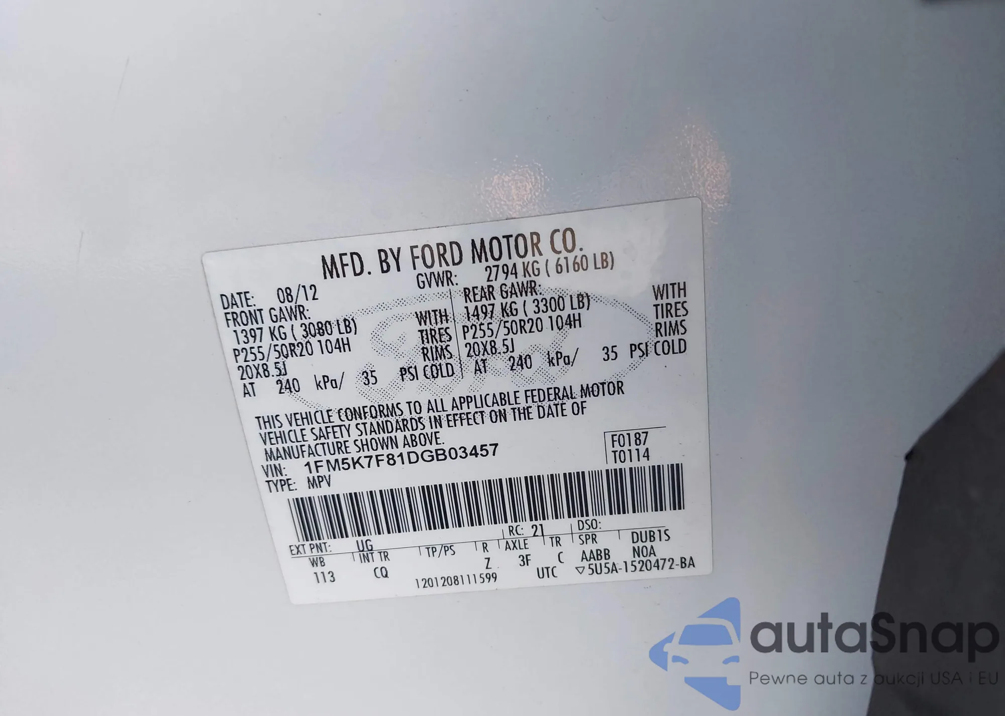 LOT: 43461753 VIN: 1FM5K7F81DGB03457