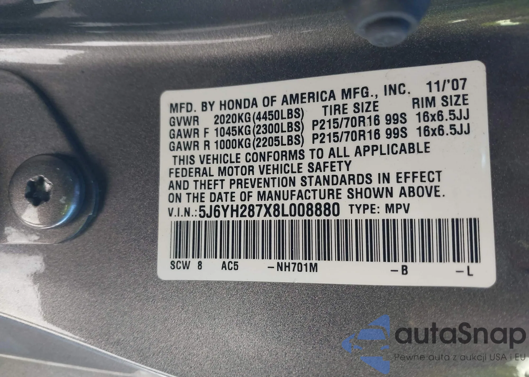 • VIN 5J6YH287X8L008880