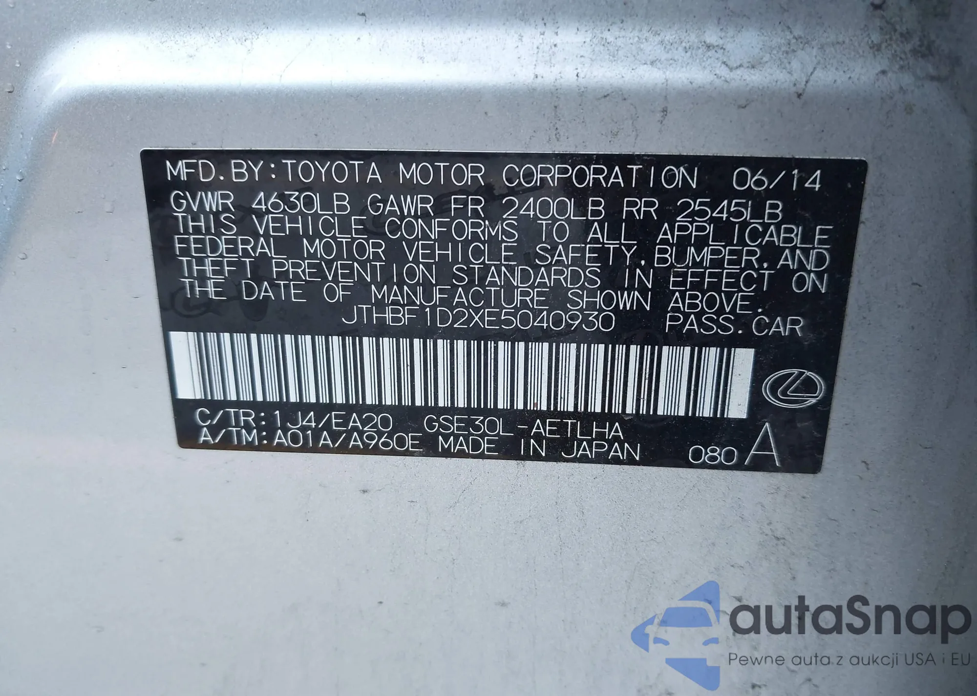 LOT: 43135966 VIN: 1HGCR2F50EA249919