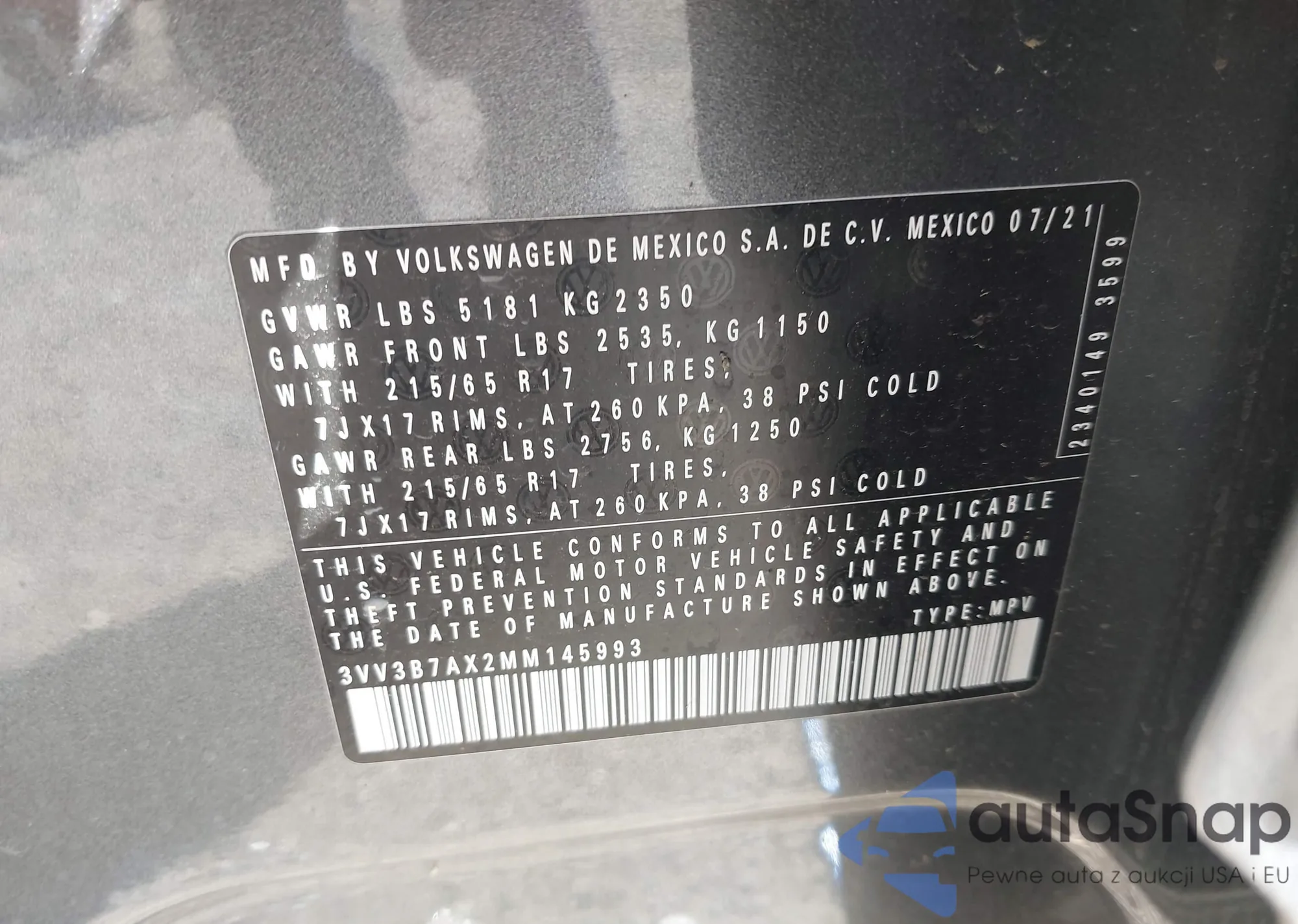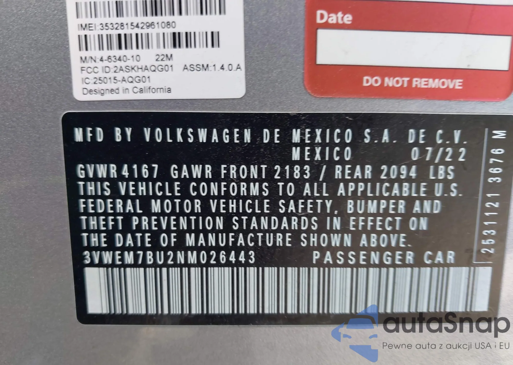 LOT: 43301524 VIN: 3VWEM7BU2NM026443