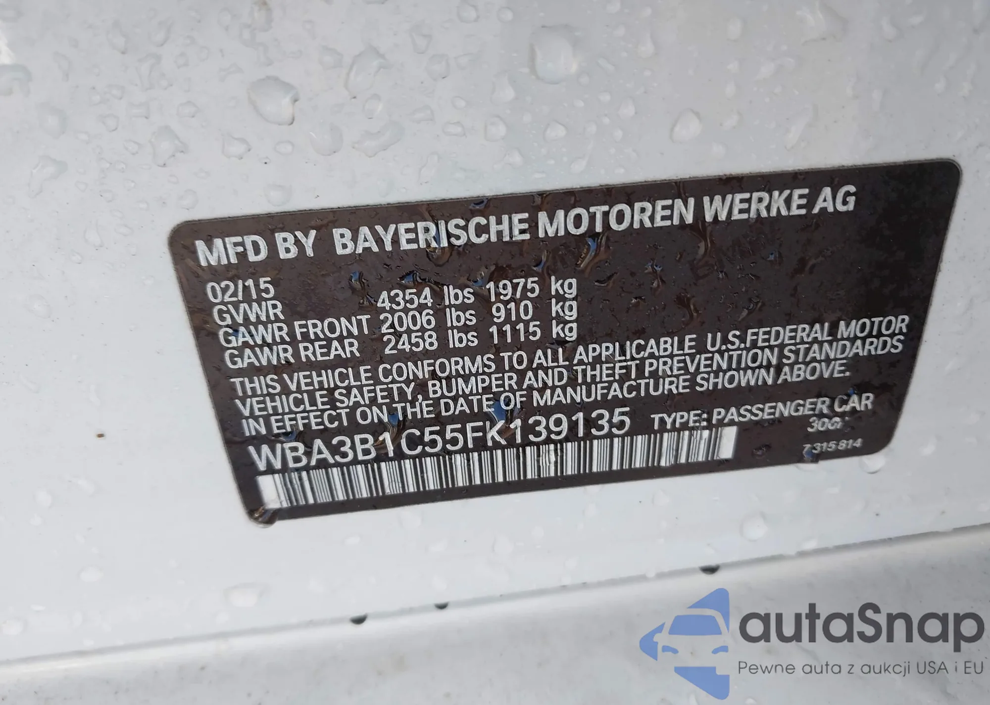 LOT: 43392405 VIN: WBA3B1C55FK139135