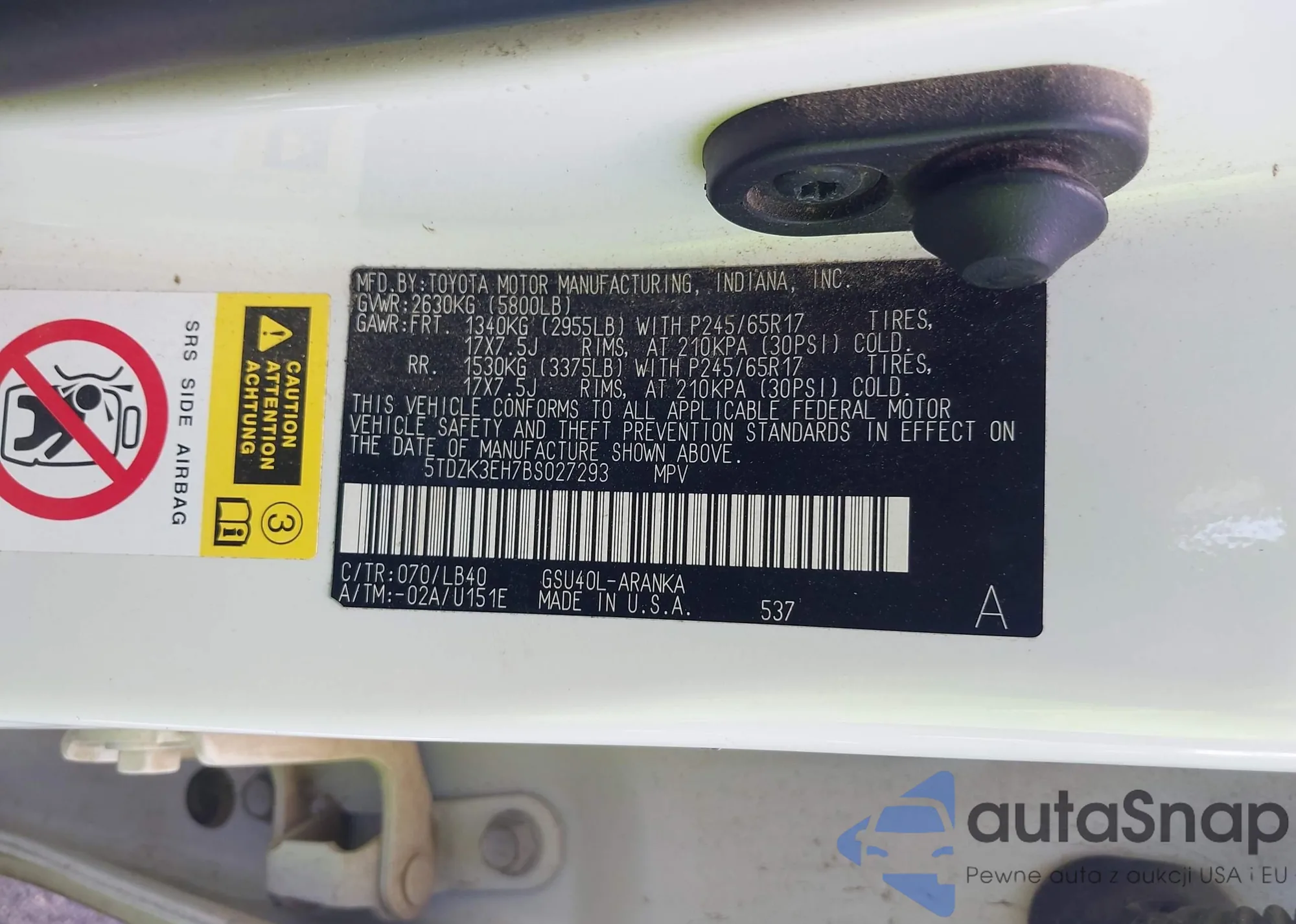 LOT: 43353832 VIN: 5TDZK3EH7BS027293