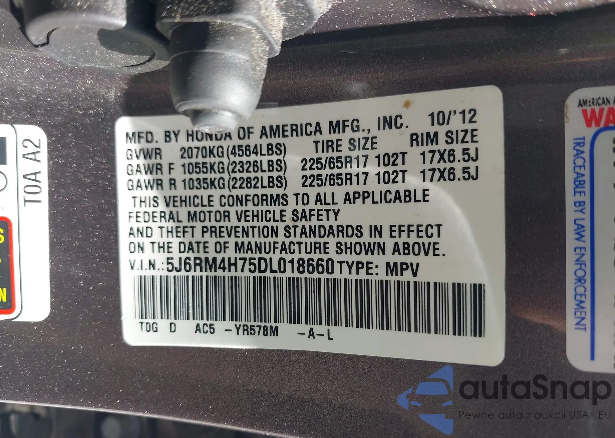 LOT: 42917734 VIN: 2HKYF18587H529782