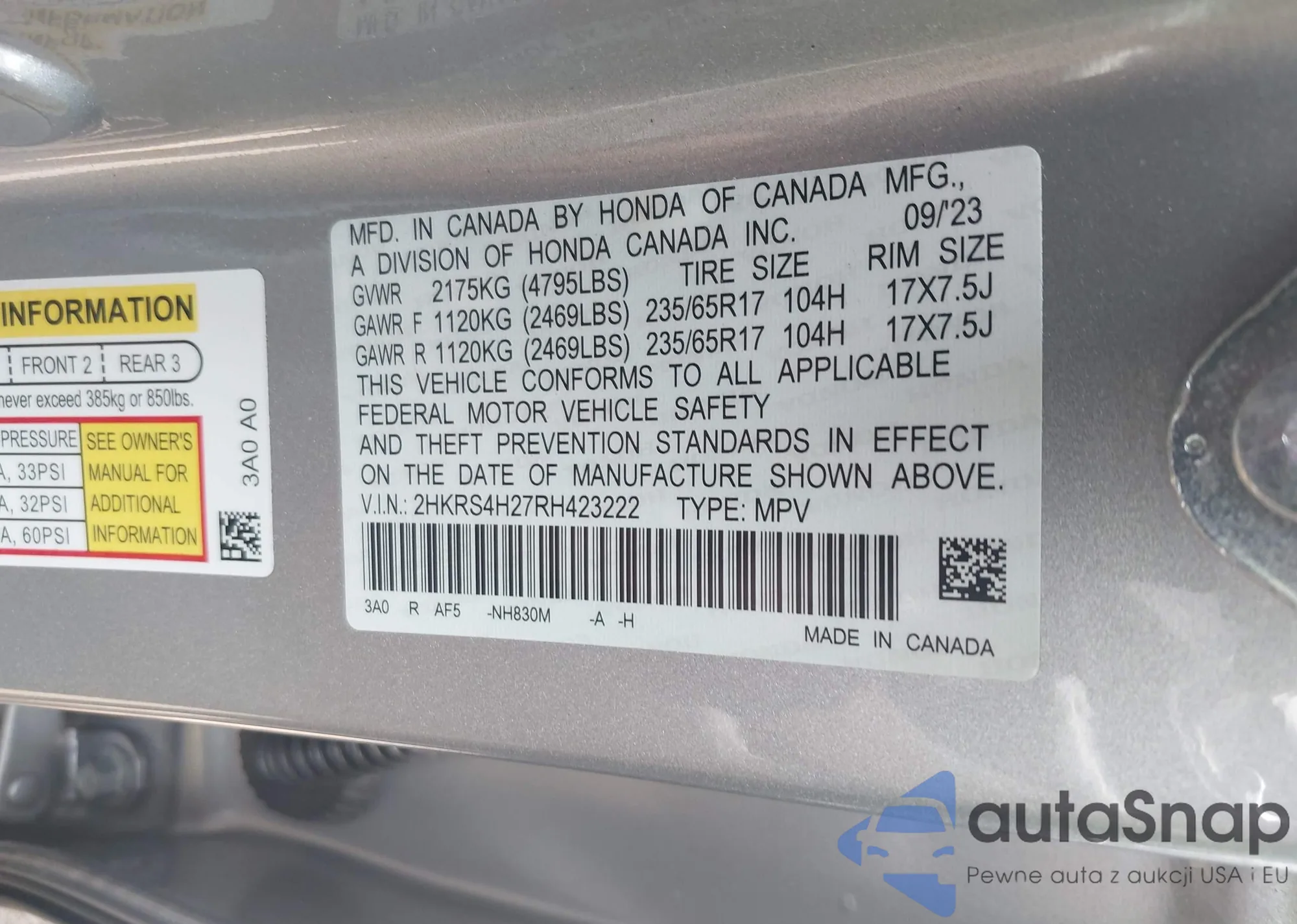 • VIN 2HKRS4H27RH423222