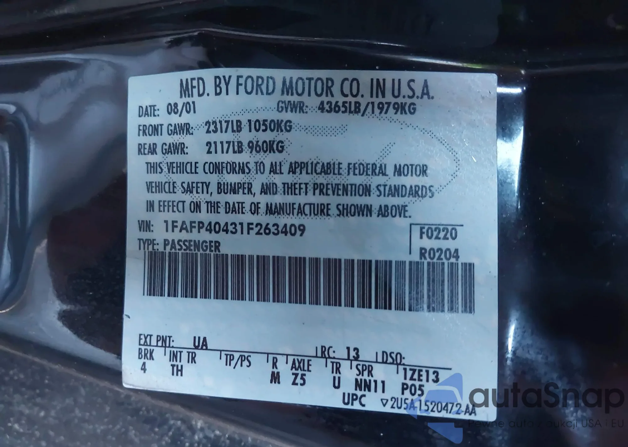 • VIN 1FAFP40431F263409