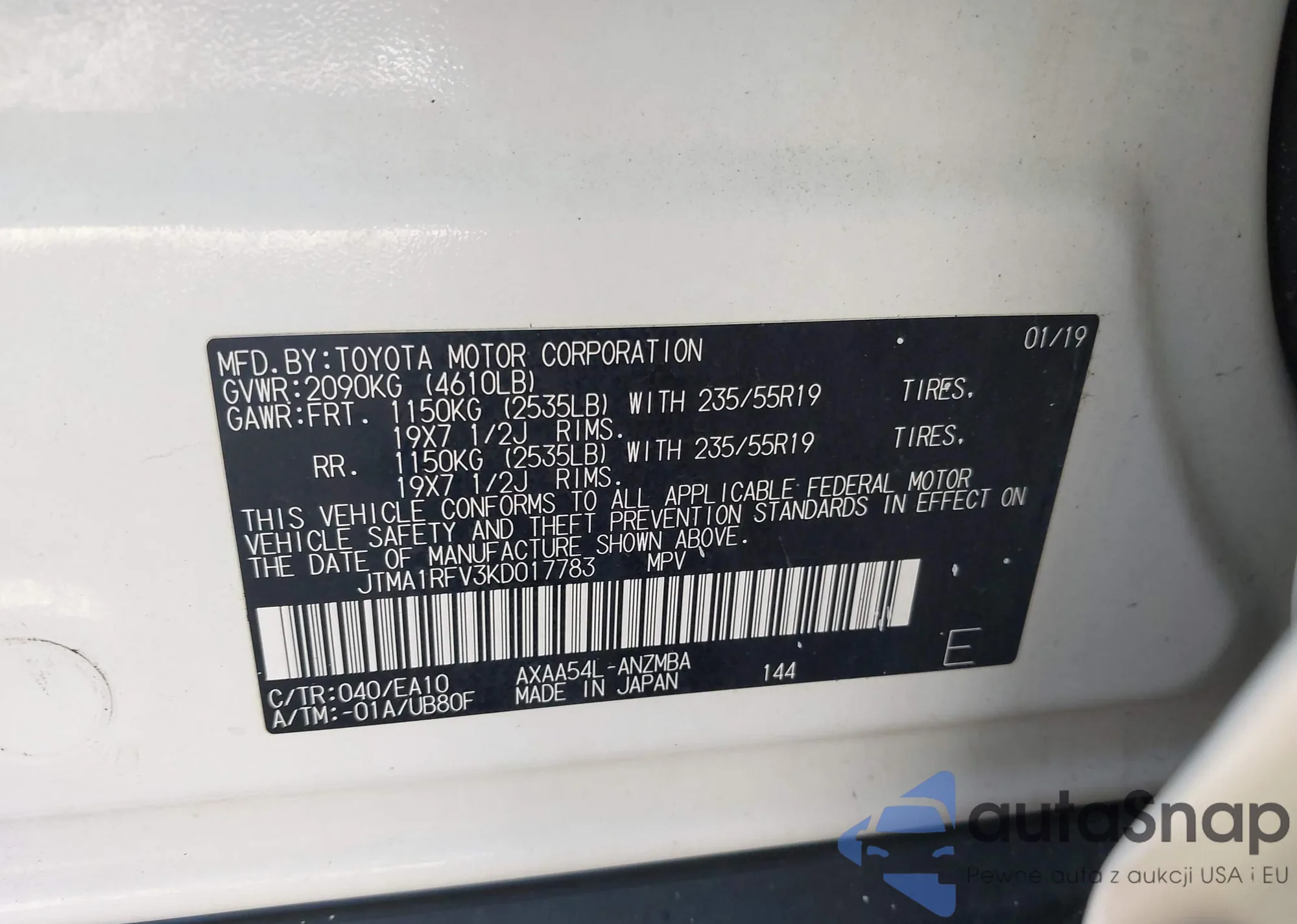 LOT: 43299033 VIN: JTMA1RFV3KD017783