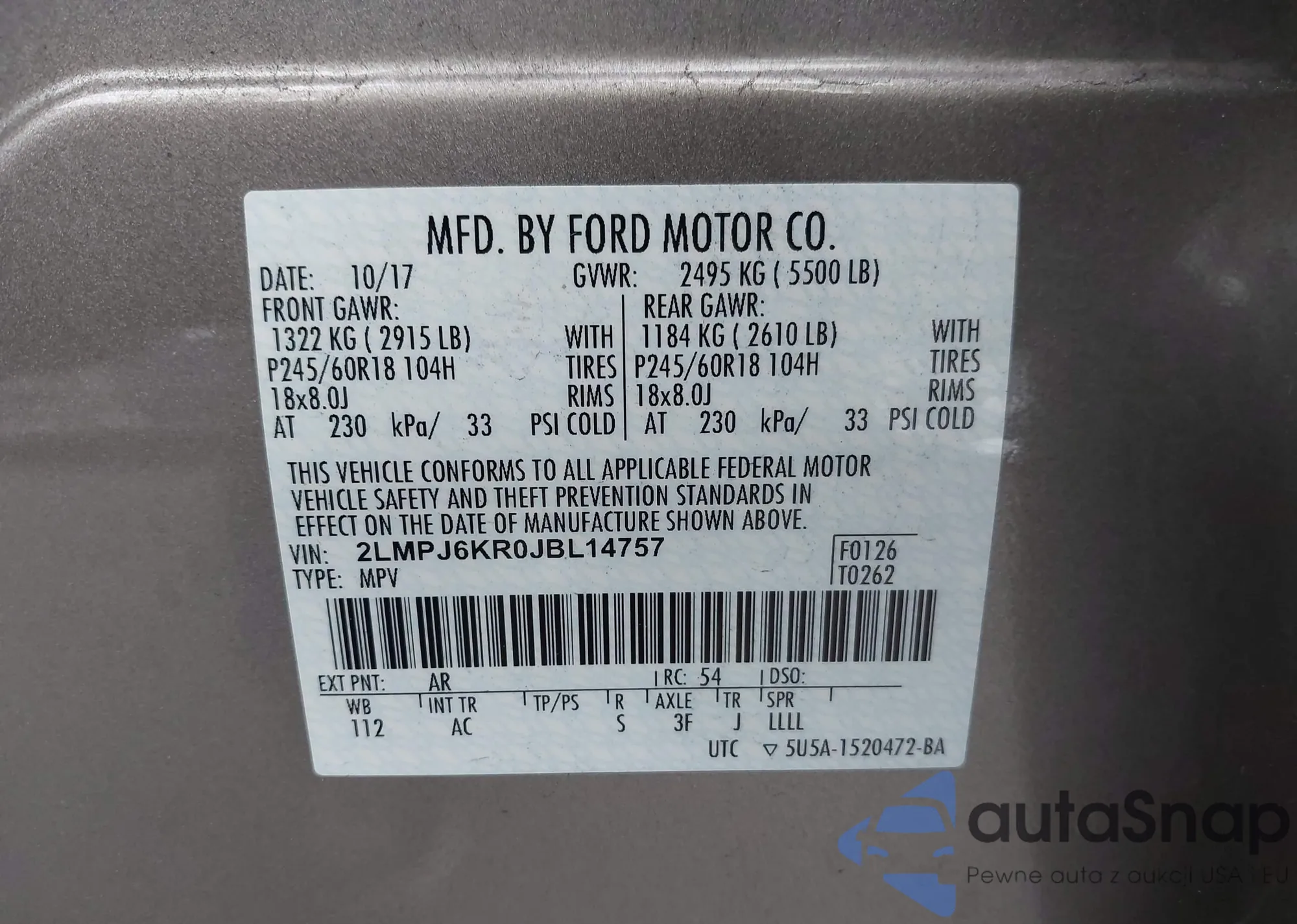 LOT: 43350914 VIN: 3FA6P0PU3JR106075