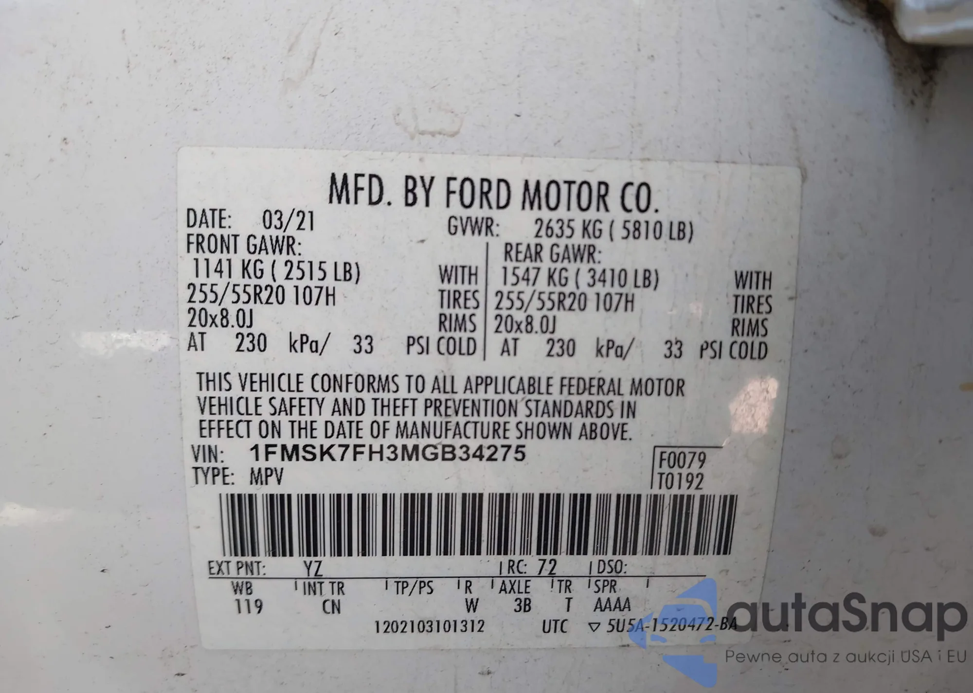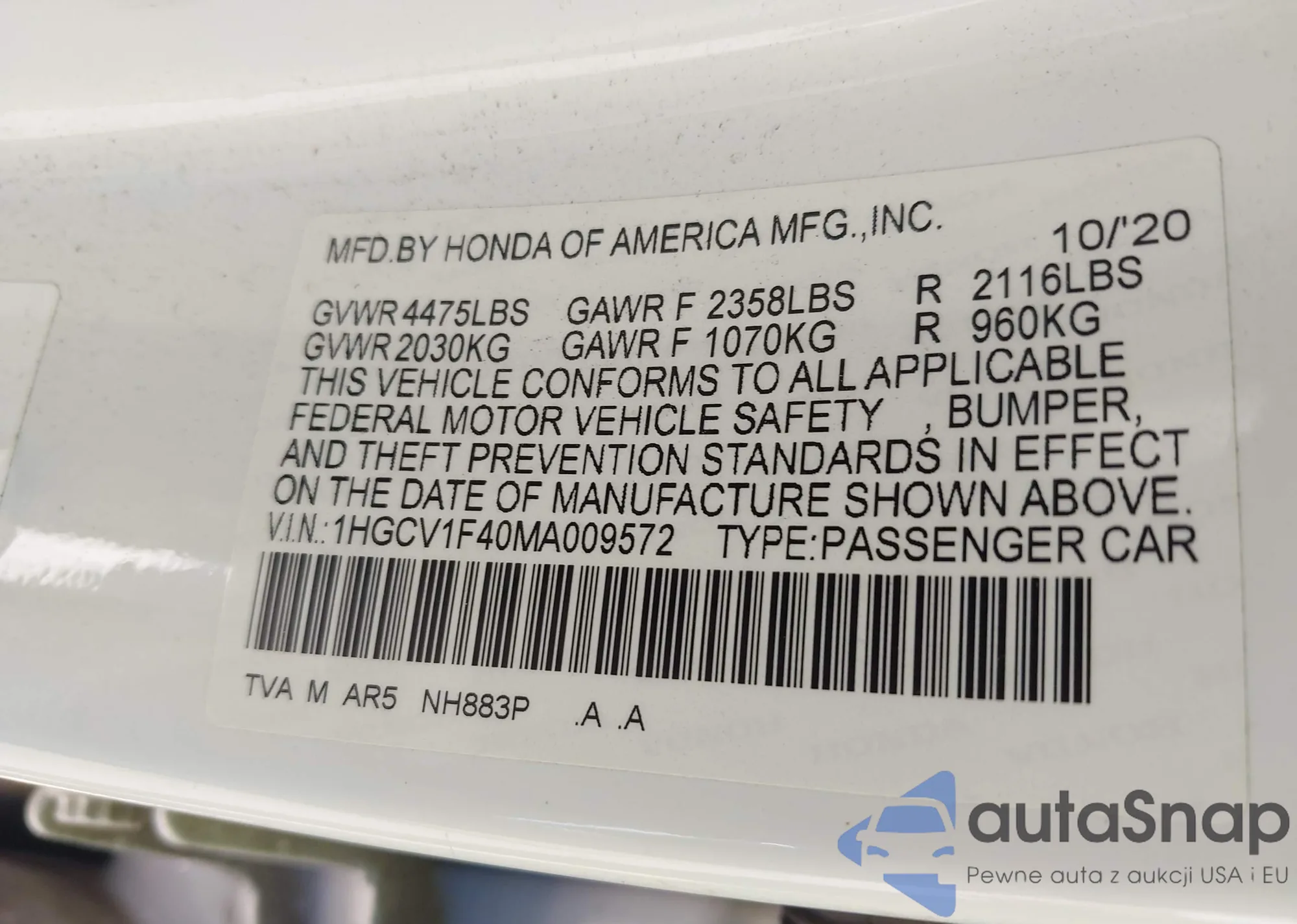 LOT: 43377006 VIN: 1HGCV1F40MA009572