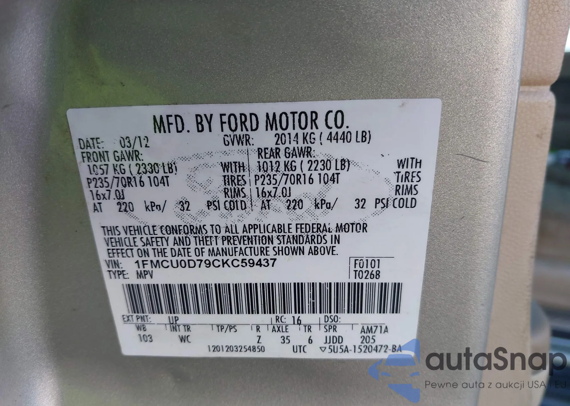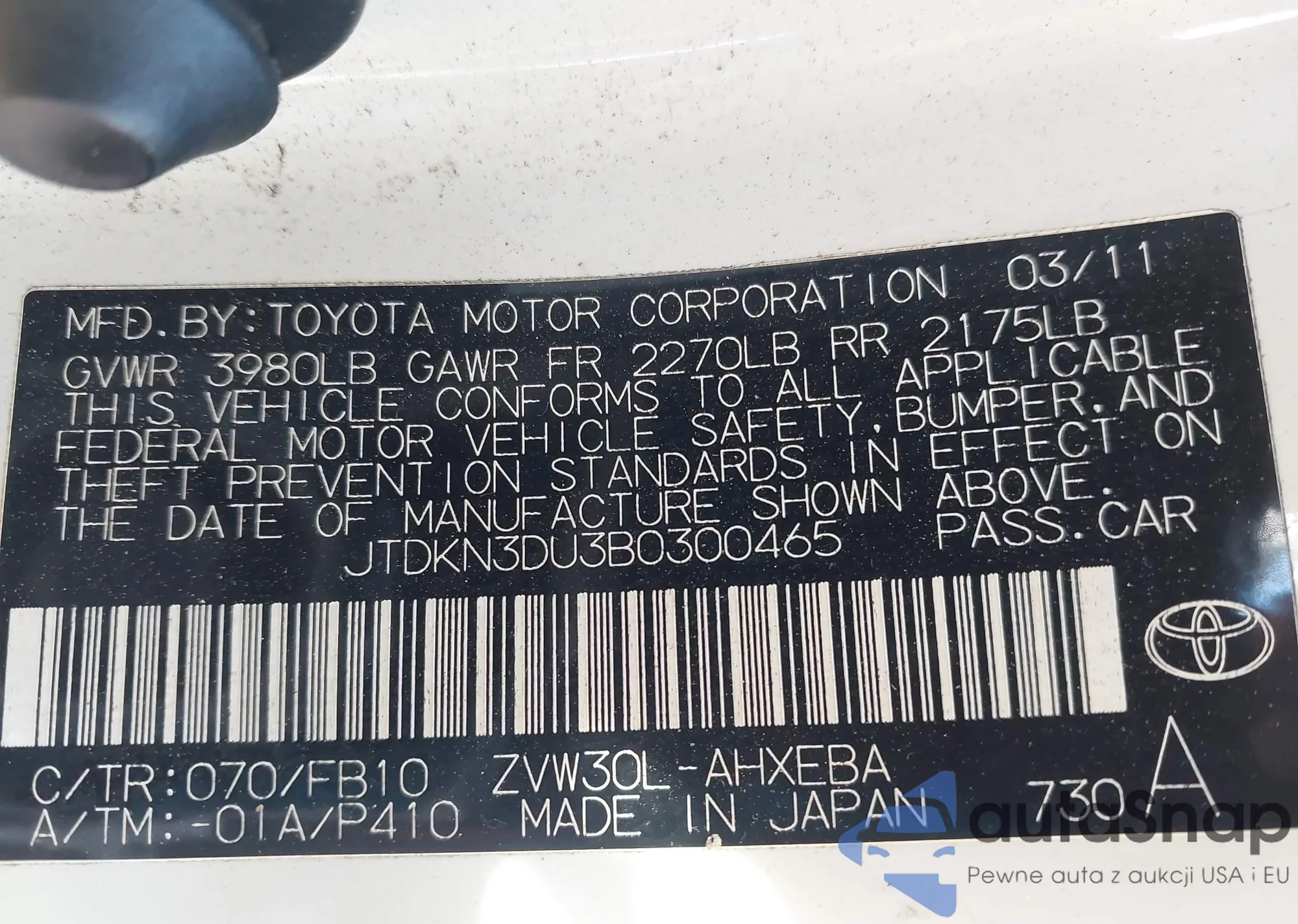 LOT: 43512943 VIN: JTDKN3DU3B0300465