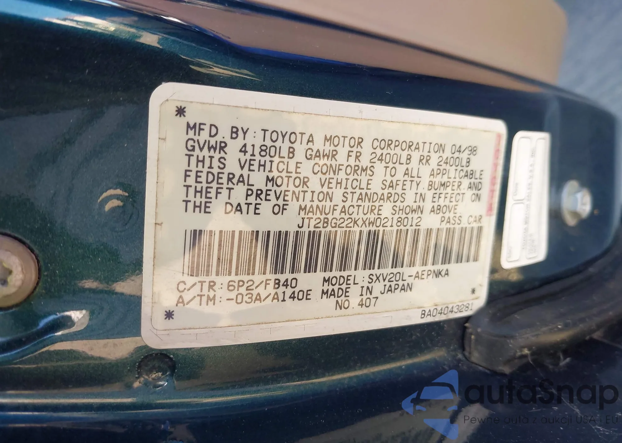 LOT: 43423460 VIN: JT2BG22KXW0218012