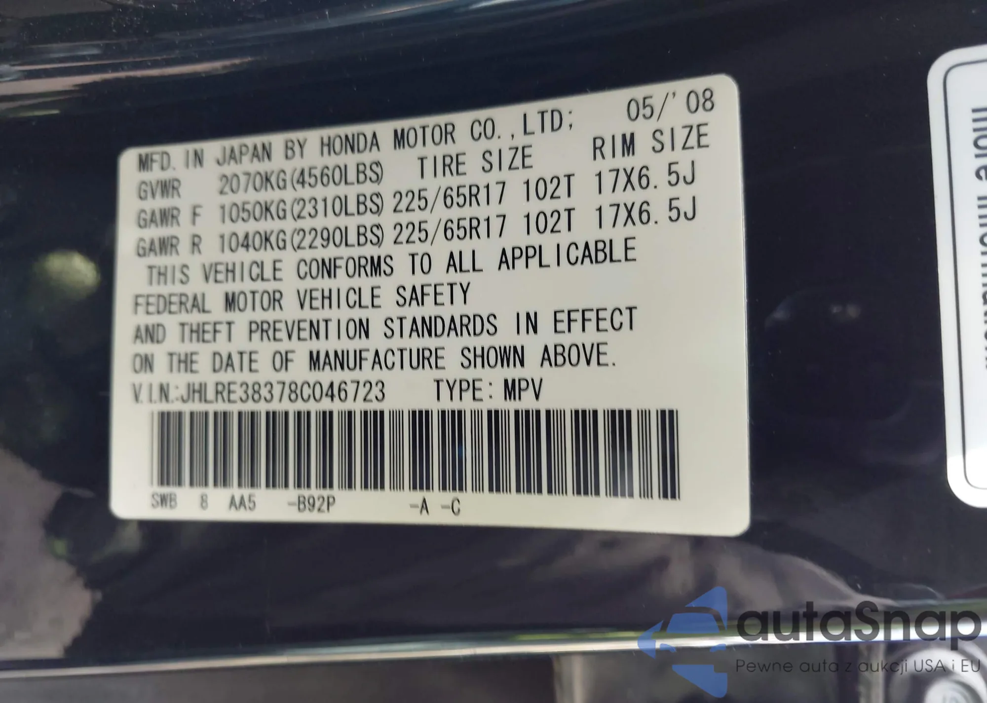 • VIN JHLRE38378C046723