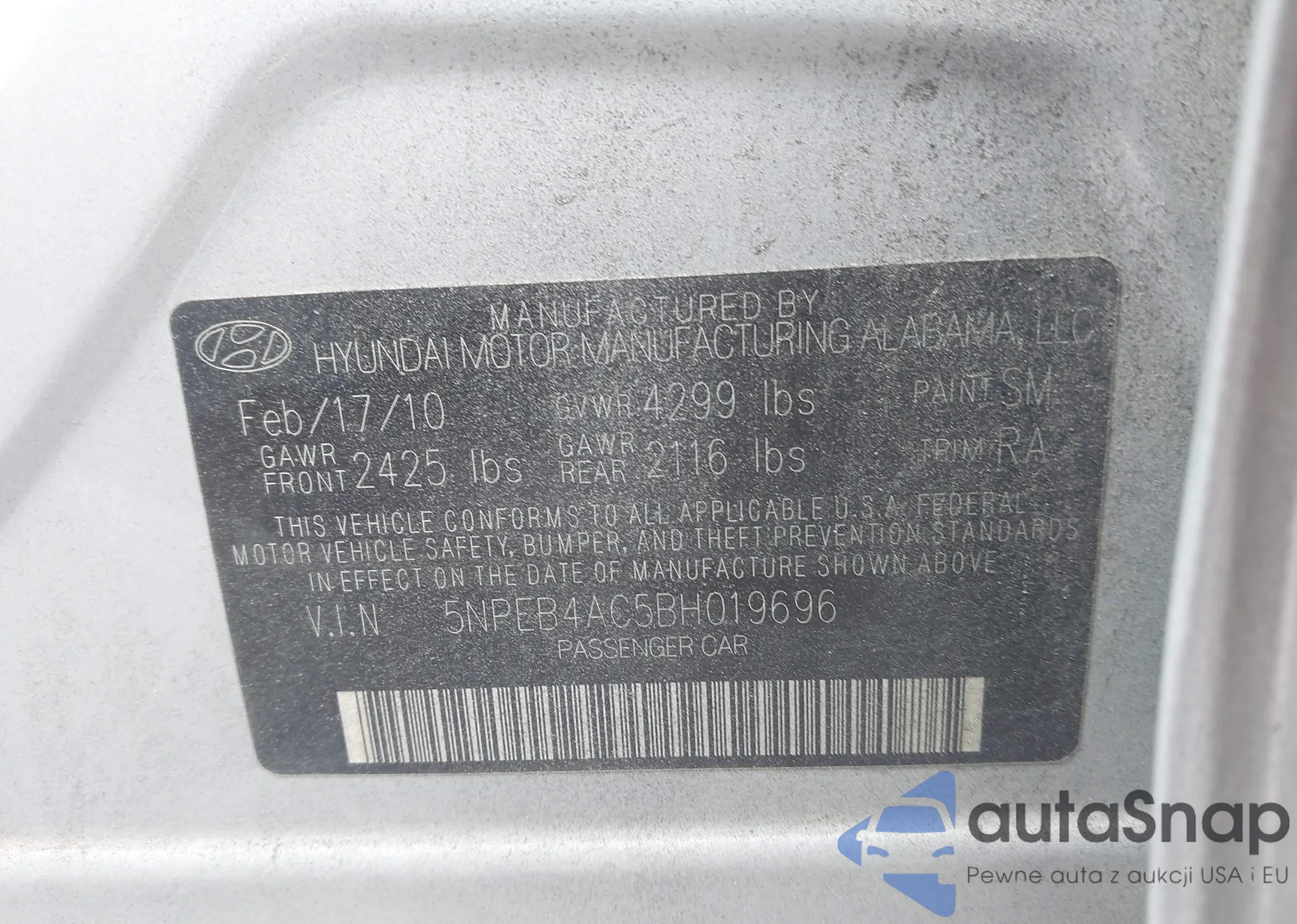 • VIN 5NPEB4AC5BH019696
