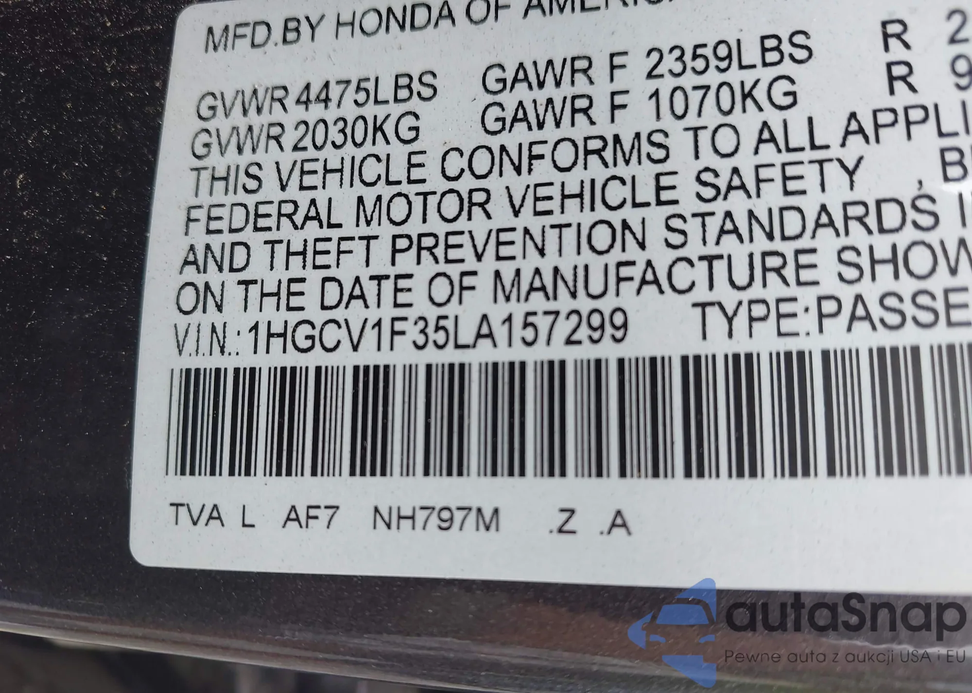 • VIN 1HGCV1F35LA157299