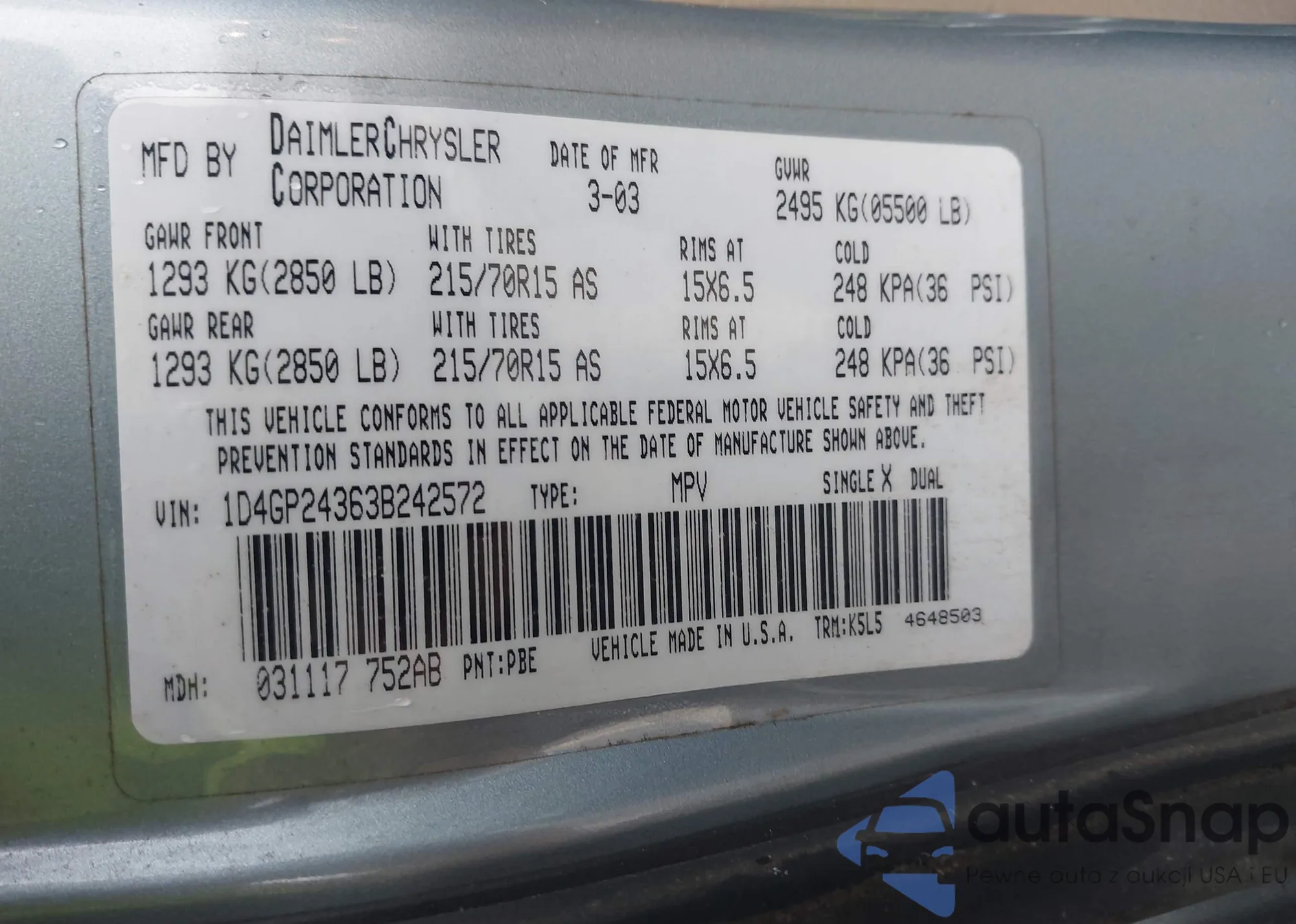 LOT: 43328813 VIN: 1D4GP24363B242572