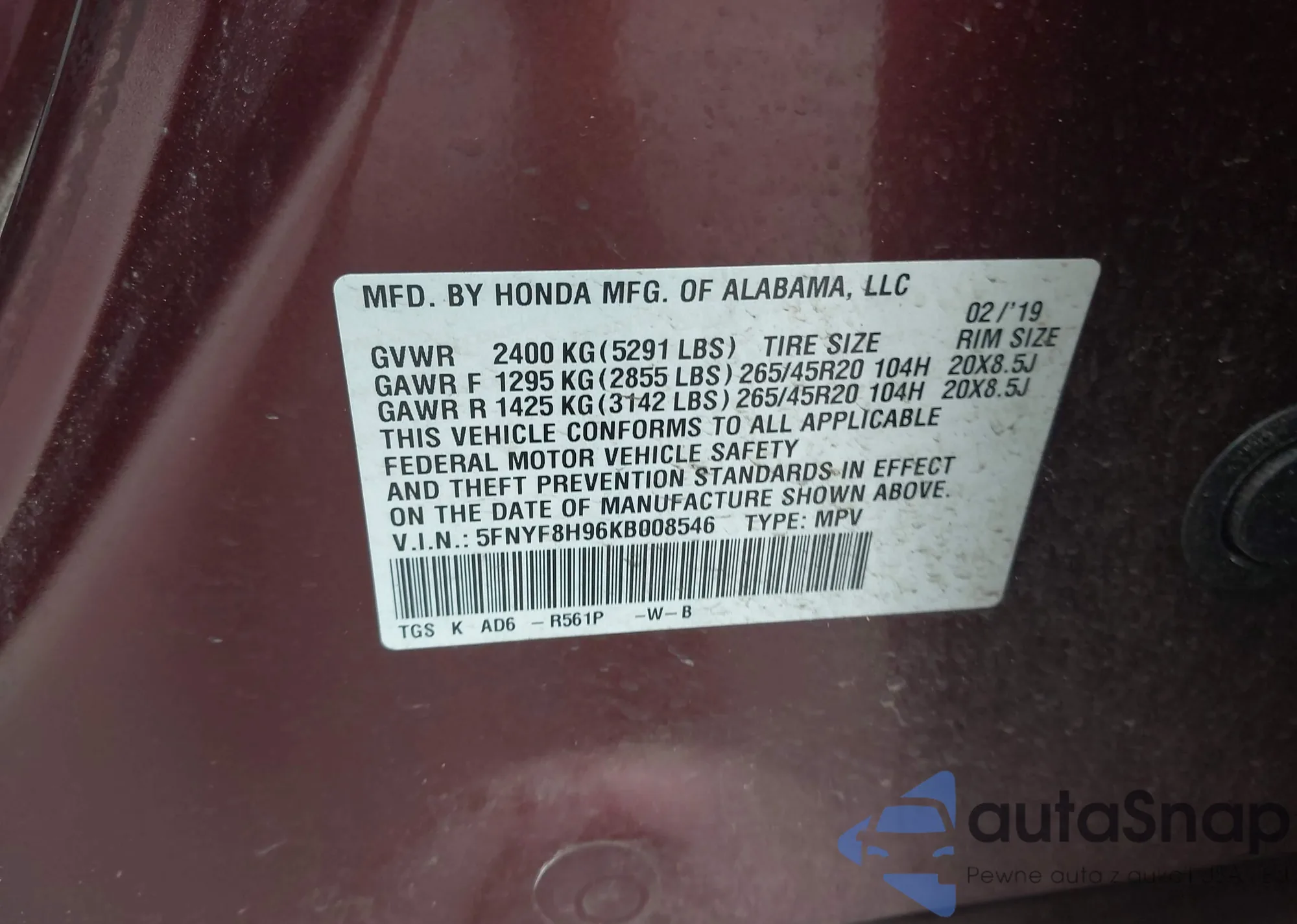 LOT: 43334113 VIN: 5FNYF8H96KB008546