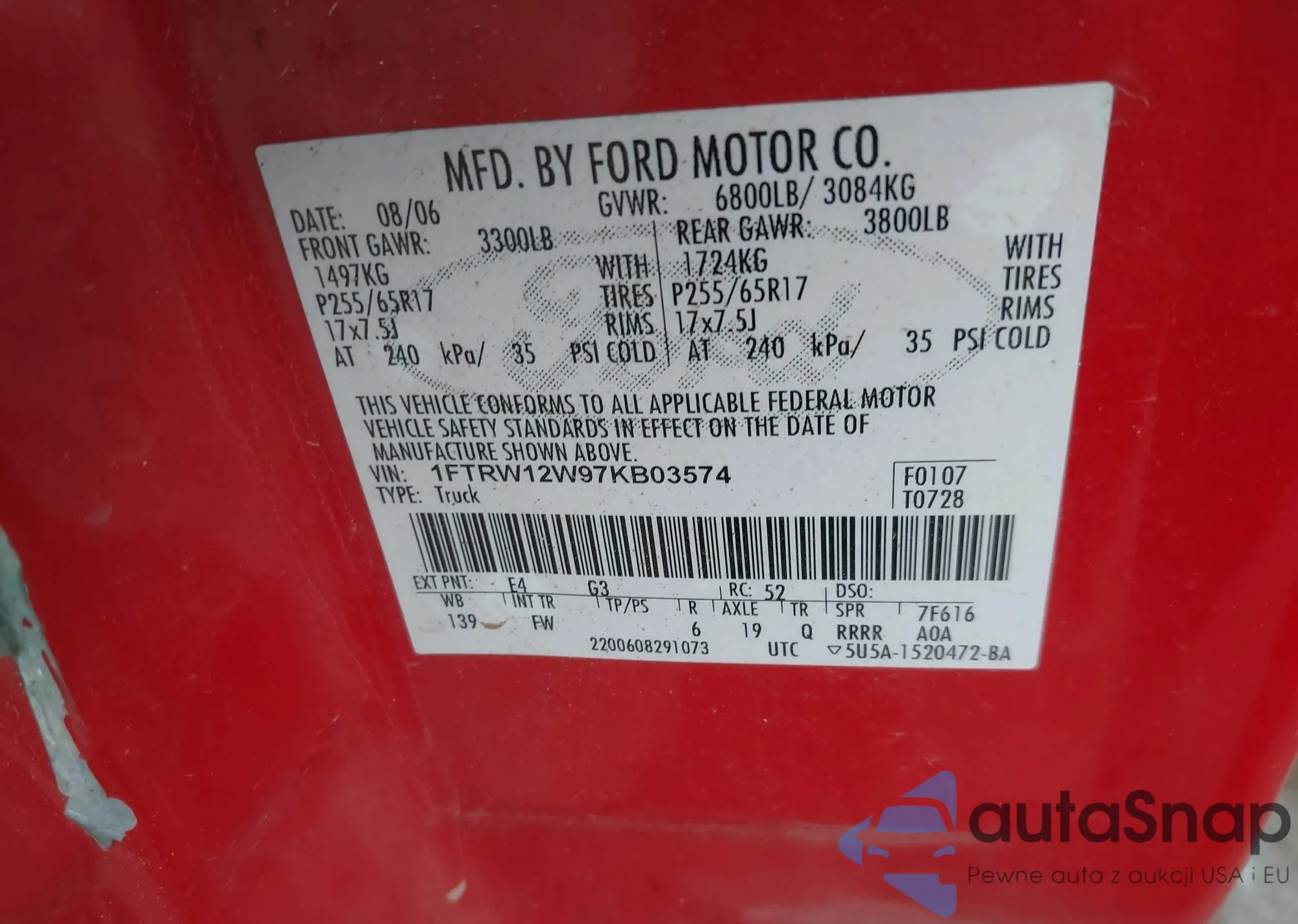 • VIN 1FTRW12W97KB03574