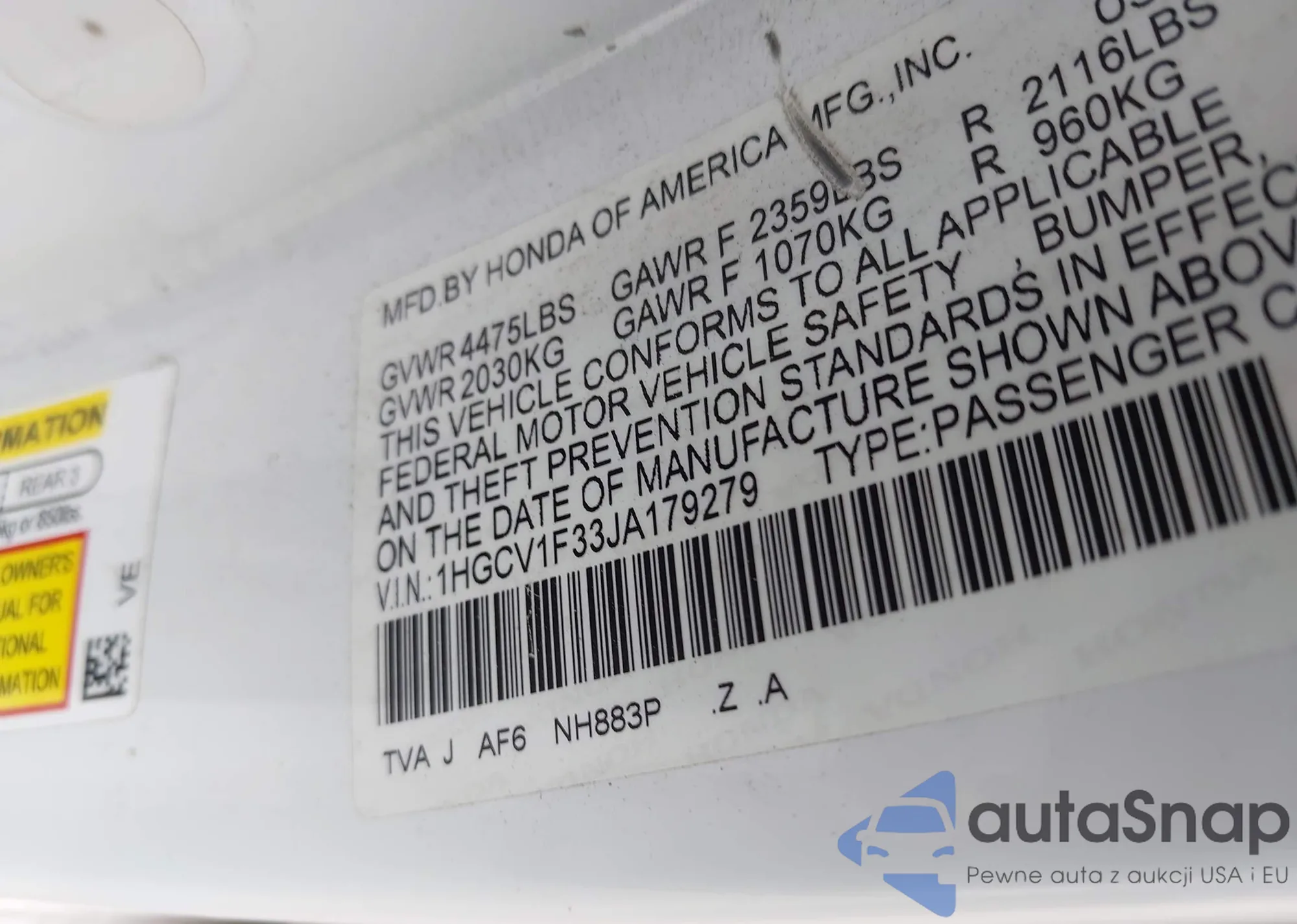 LOT: 43348706 VIN: 1HGCV1F33JA179279
