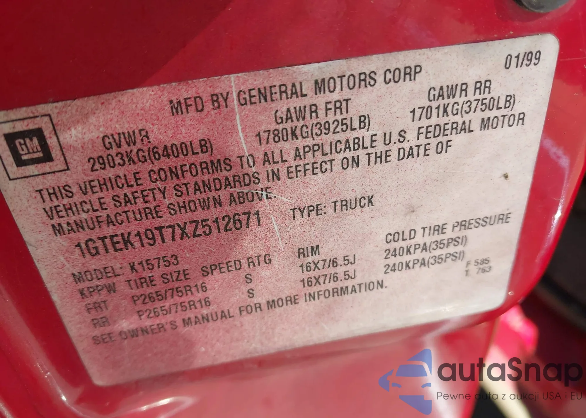 • VIN 1GTEK19T7XZ512671
