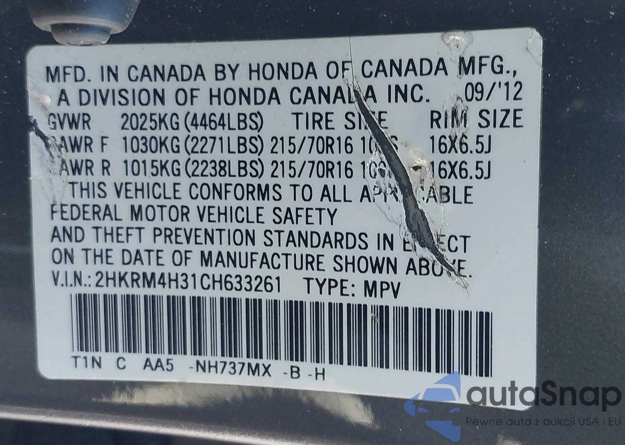 • VIN 2HKRM4H31CH633261