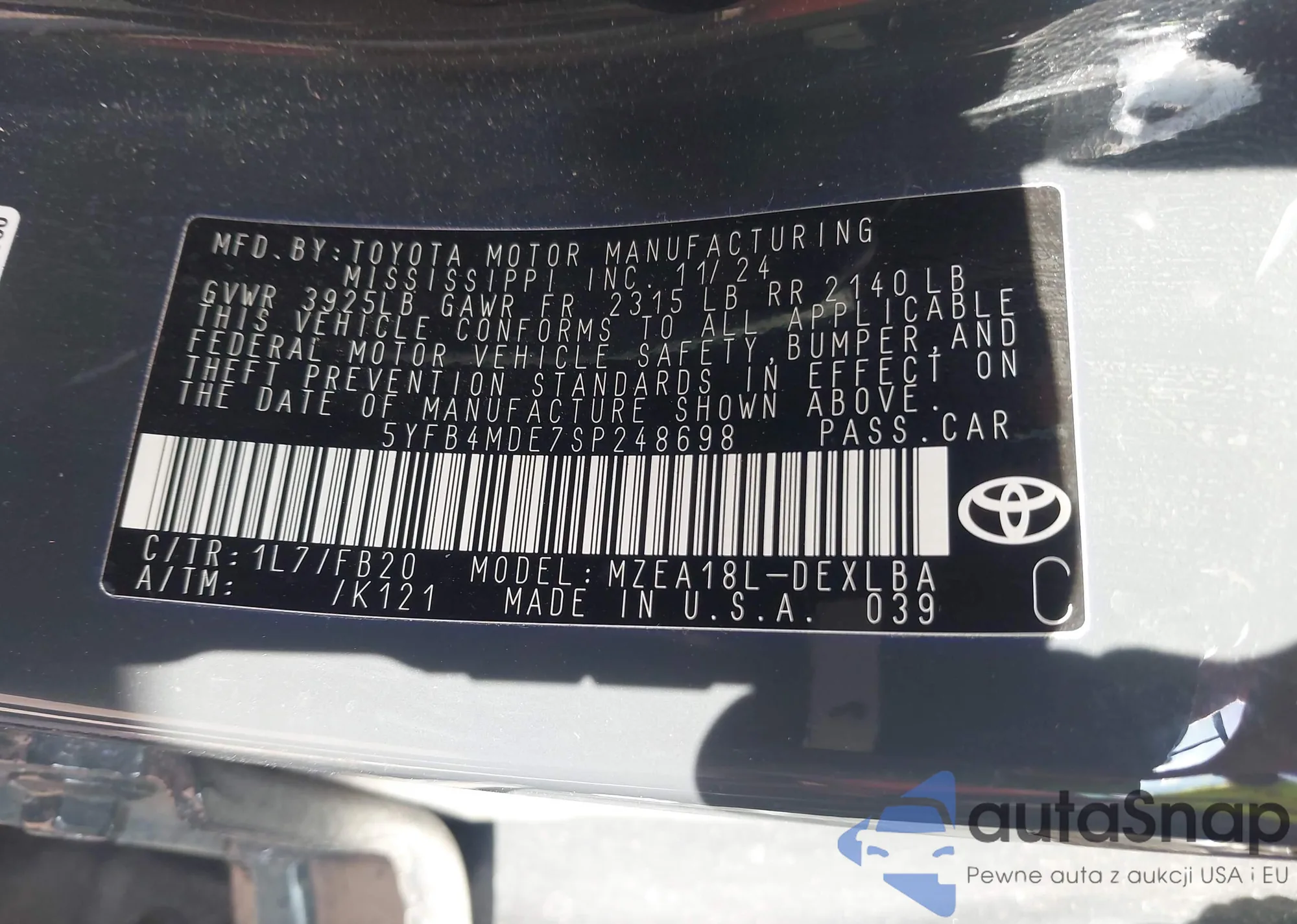 • VIN 5YFB4MDE7SP248698